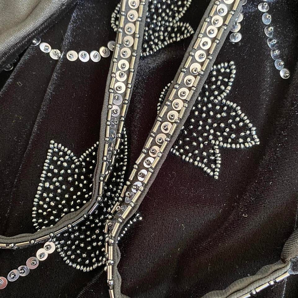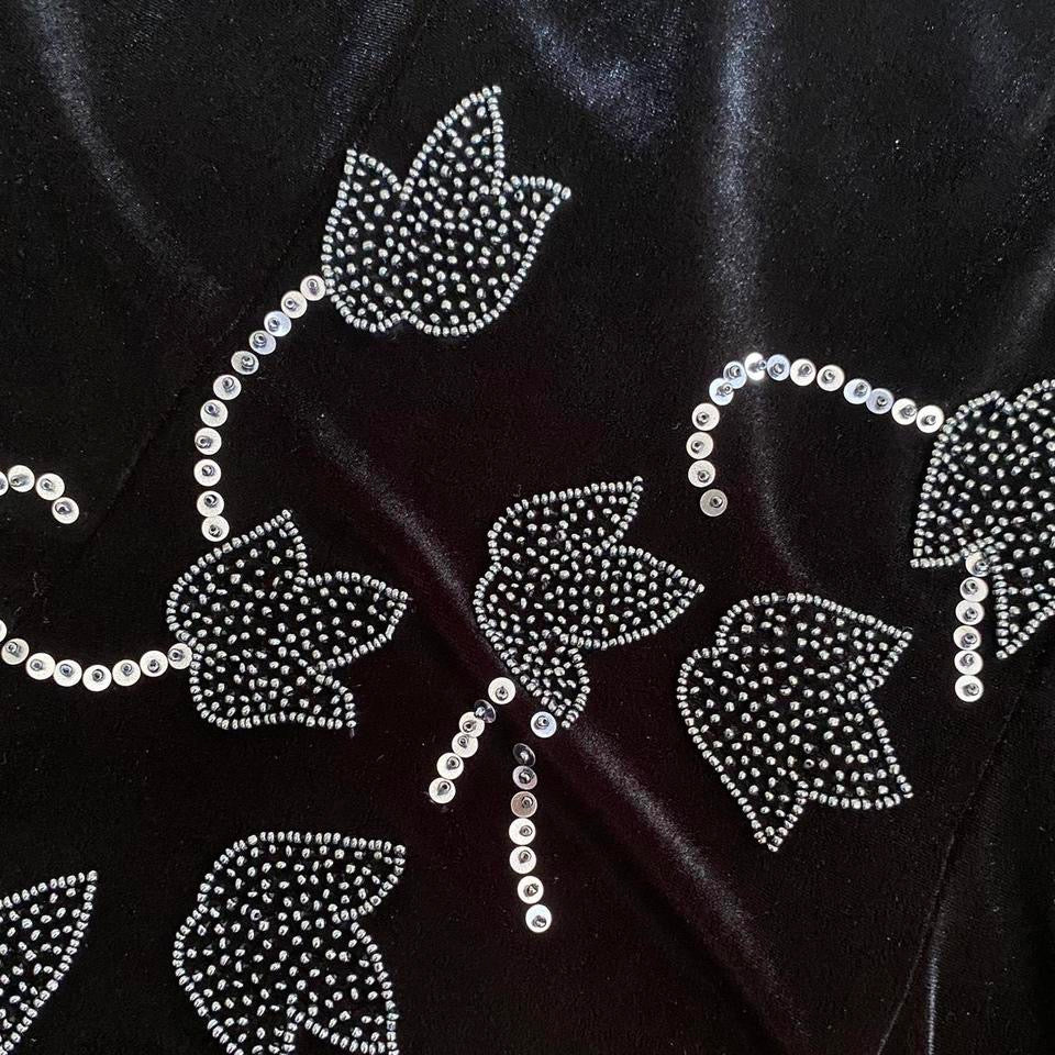 🌹Black velvet evening dress UK 12🌹Chic black velvet stretch evening dress with a decorative beaded/sequin leaf design & a zip up the back🌹PLEASE NOTE: the shawl isn’t available with this dress🌹