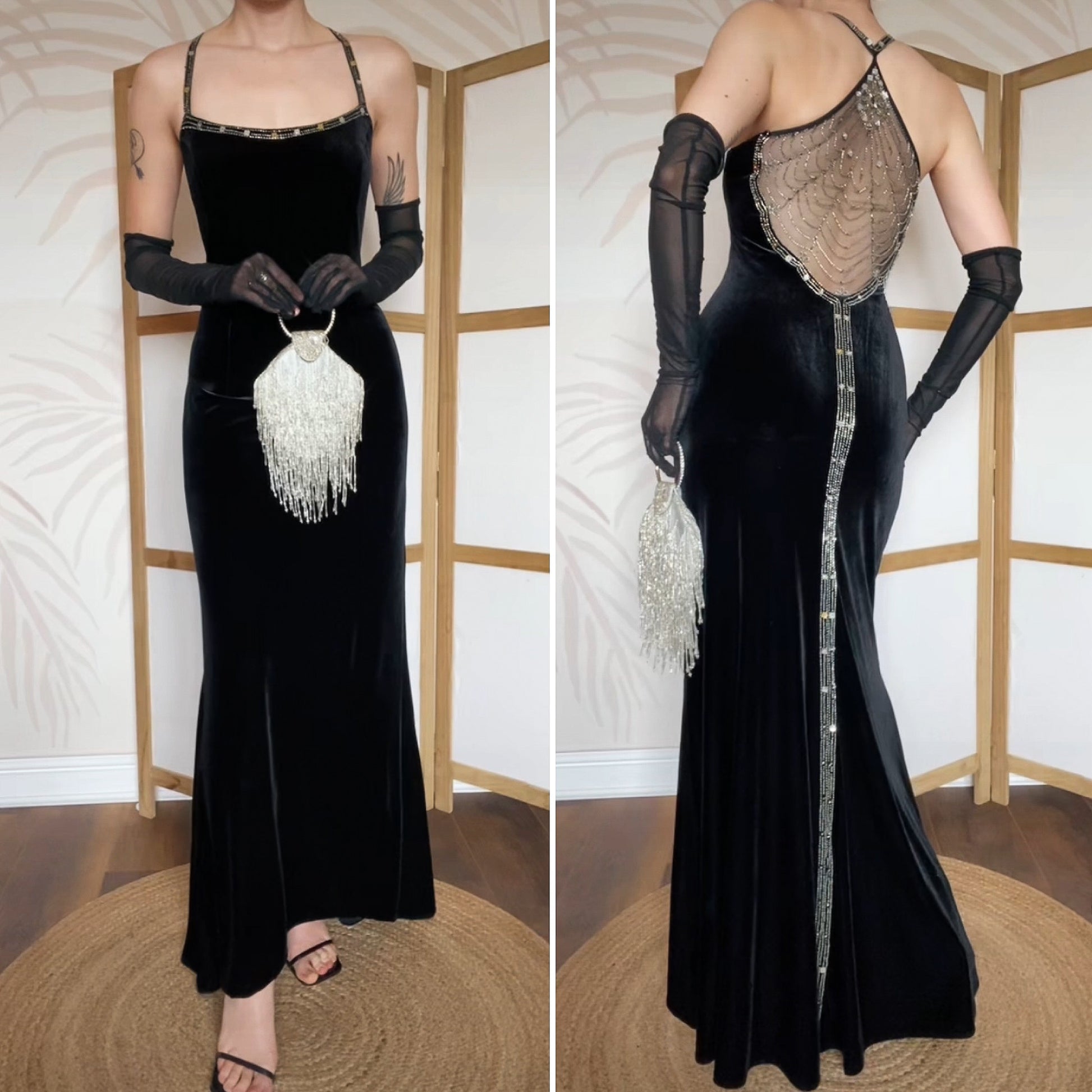 Black velvet beaded 90s evening dress uk 14