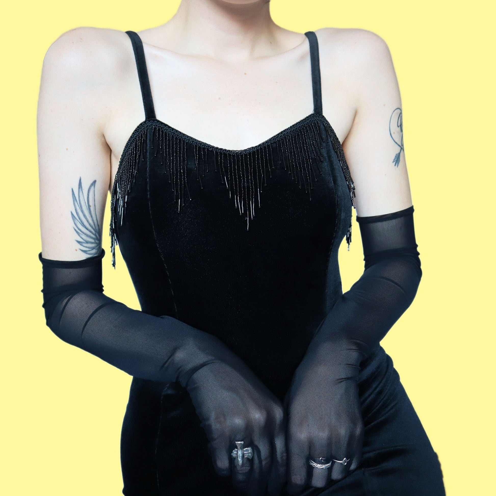 🌹Black velvet midi dress UK 10🌹Chic black velvet stretch midi dress with a slit down one leg & beaded bust detail🌹