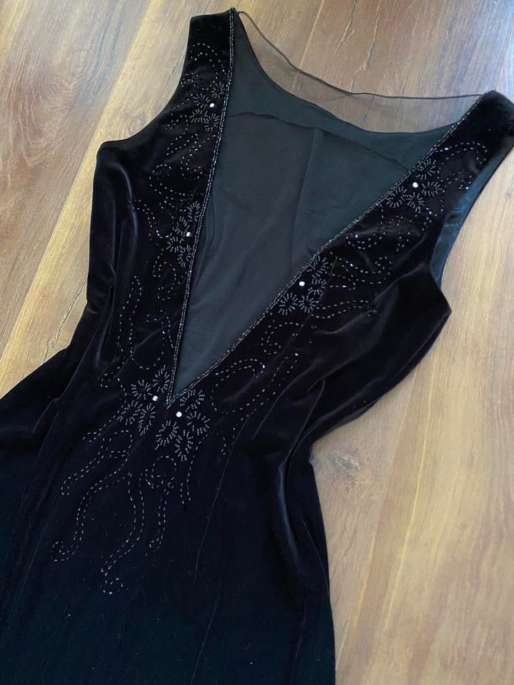 Beautiful black velvet stretch evening dress with diamanté/bead detailing, a sheer low v neck back & a zip up one side uk 12-14