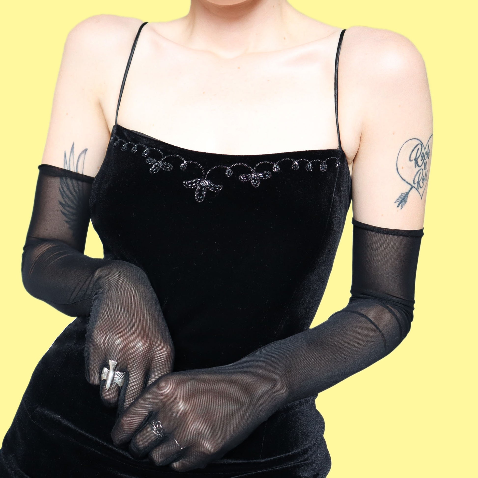 🌹Beautiful black velvet stretch evening dress with sheer cut out flare at the hem, a lace up back & a zip up the side UK 10🌹The gloves are not included🌹