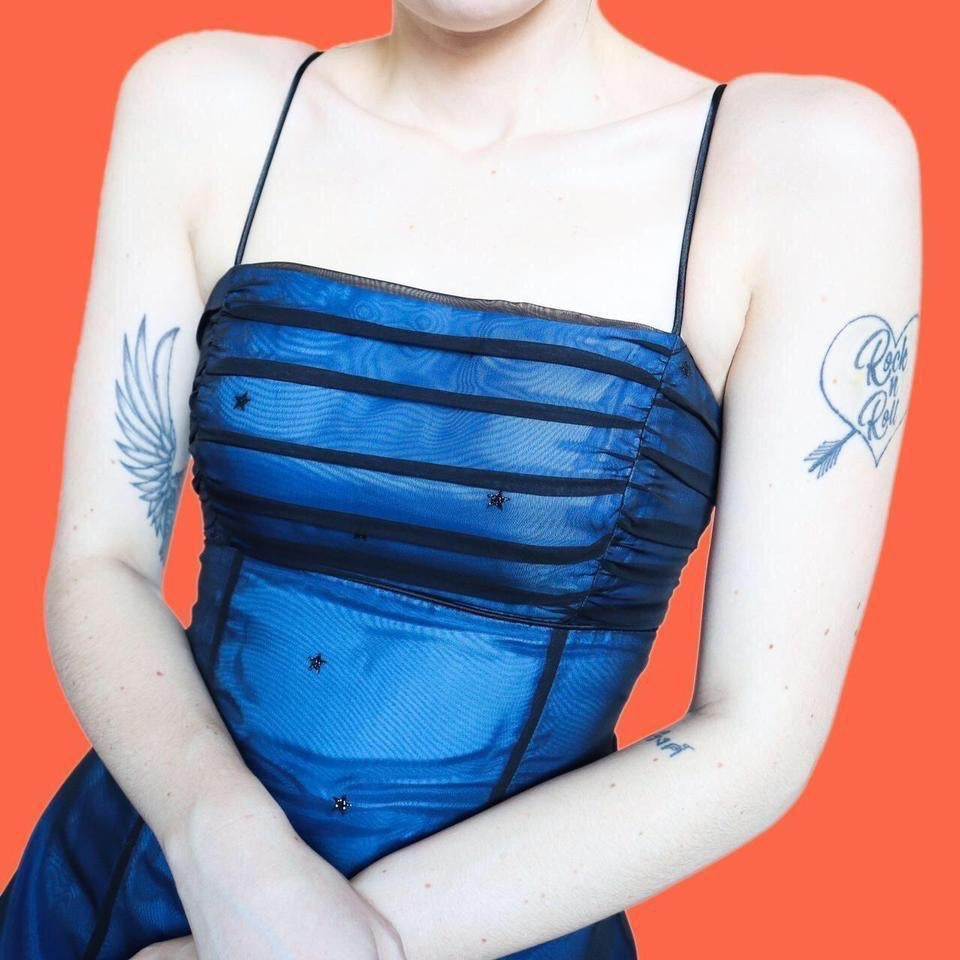 🌹Beautiful a-line evening dress with a black overlay with the blue lining showing through - the dress has cute glittery star detailing, a zip up the back & lacing at the back UK 12🌹