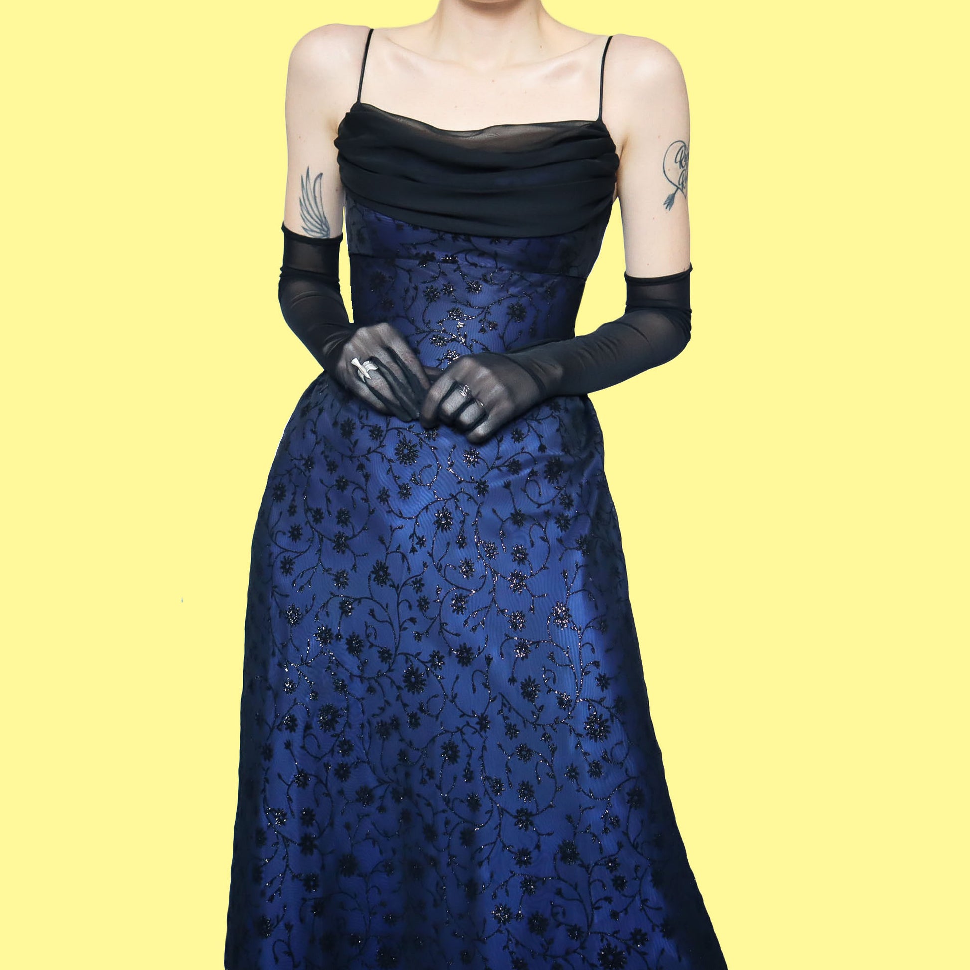 🌹Beautiful blue glittery floral print evening dress with black sheer overlay, a chiffon bust & trail & a zip up the back UK 12🌹