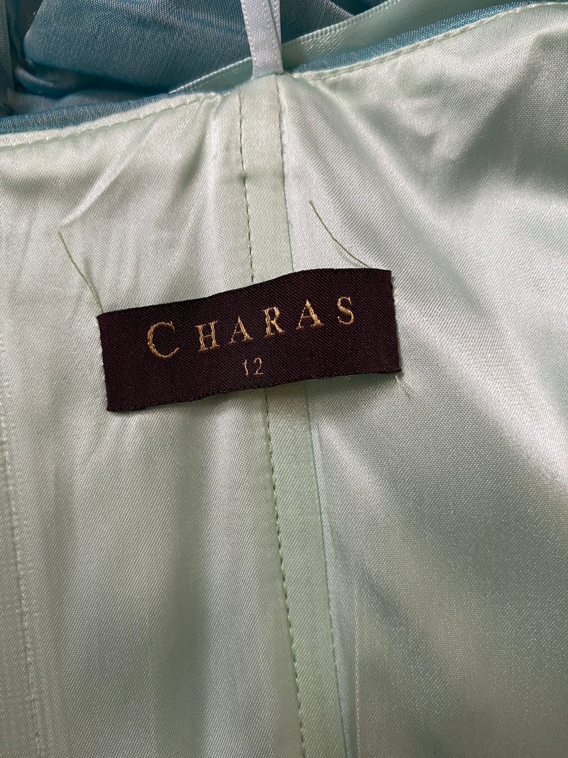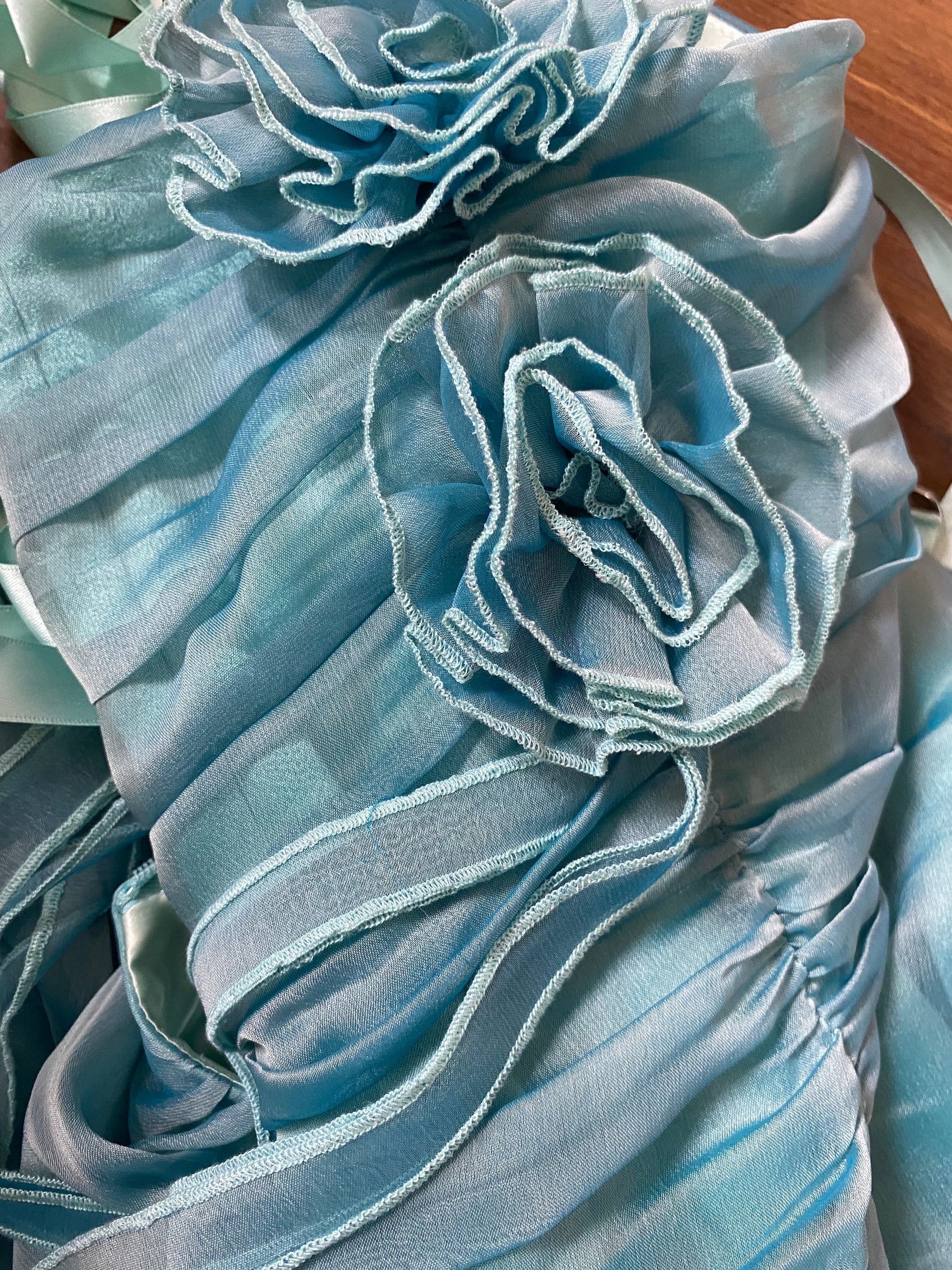Blue strapless evening midi dress with runched detailing, an adjustable ribbon lace up back, boning to the waist & bust & a zip up the back UK 8-10