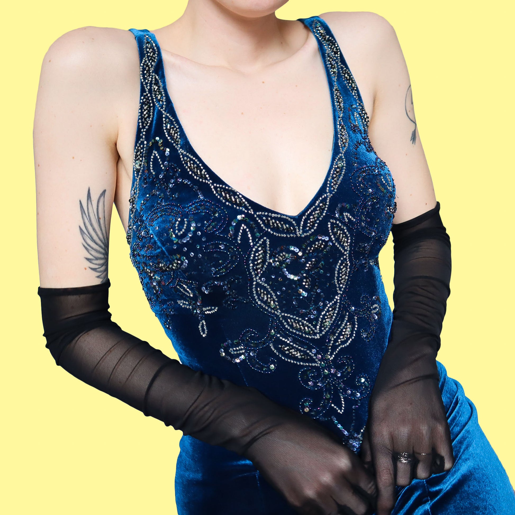 🌹Electric blue velvet stretch evening dress with cross over straps at the back, bead & sequin detailed front, a padded bust & a zip up the back UK 12🌹