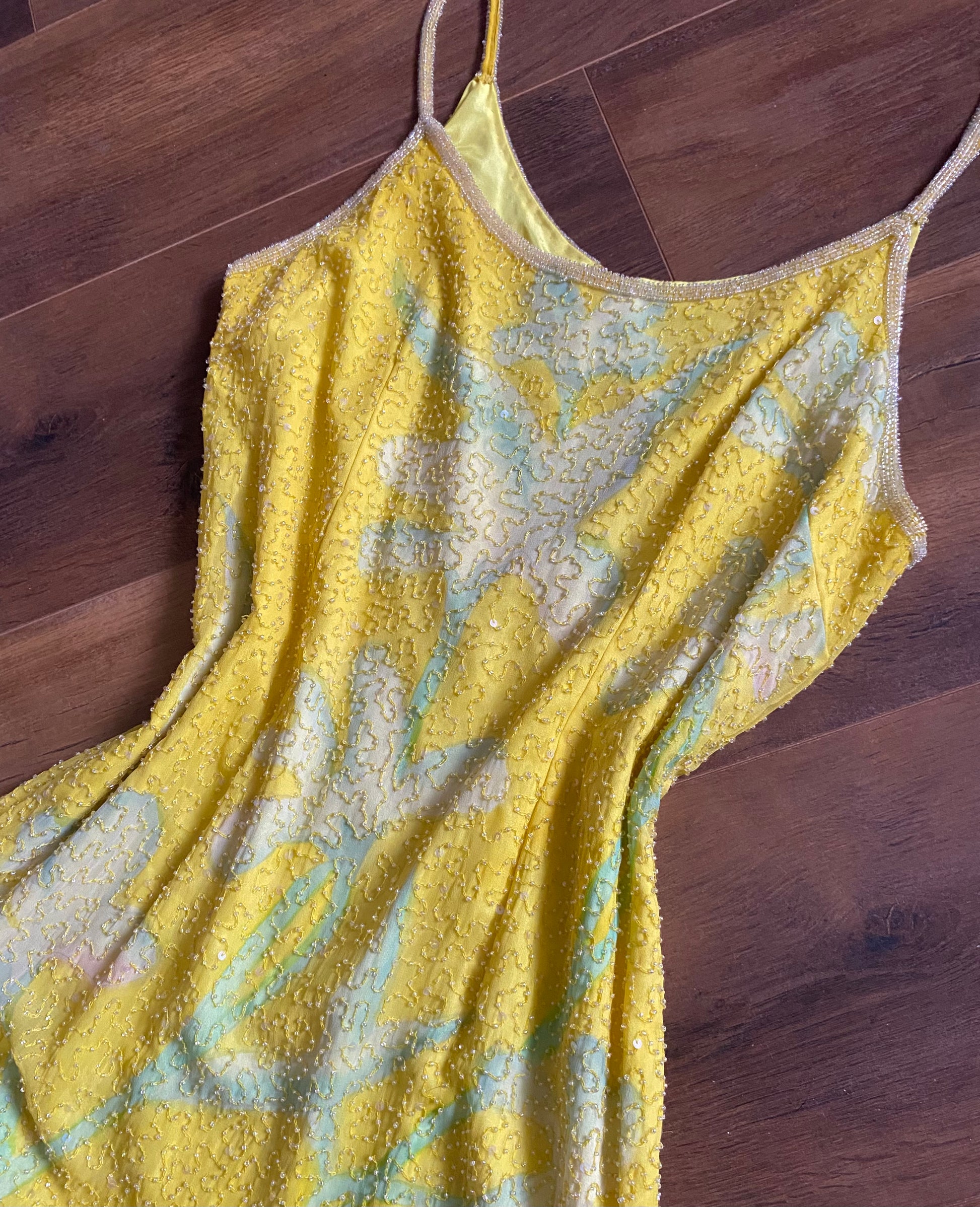 Beautiful bright yellow 100% silk beaded evening dress with floral print & a zip up the back uk 12-14