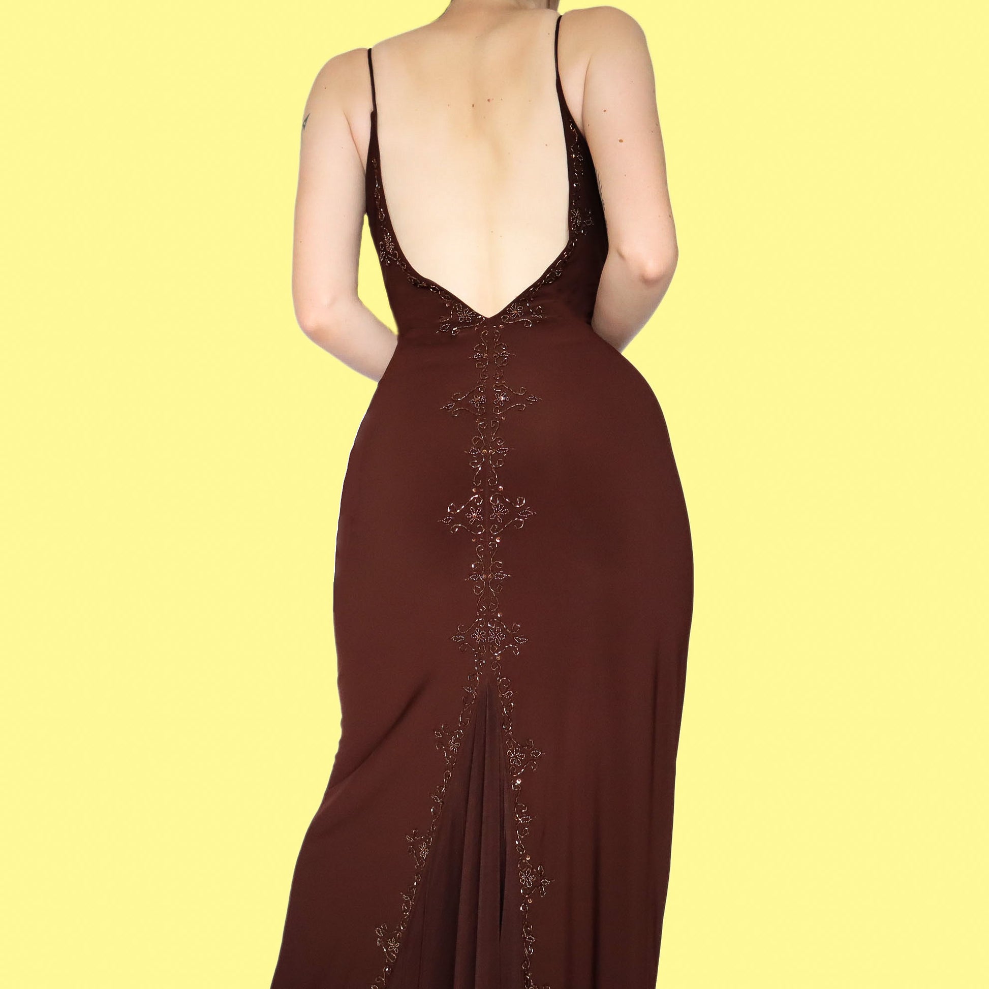 🌹Brown beaded dress UK 10🌹Chic brown beaded stretch evening dress with a low open back, sheer trail at the back, cross over bust detail & a zip up the side🌹