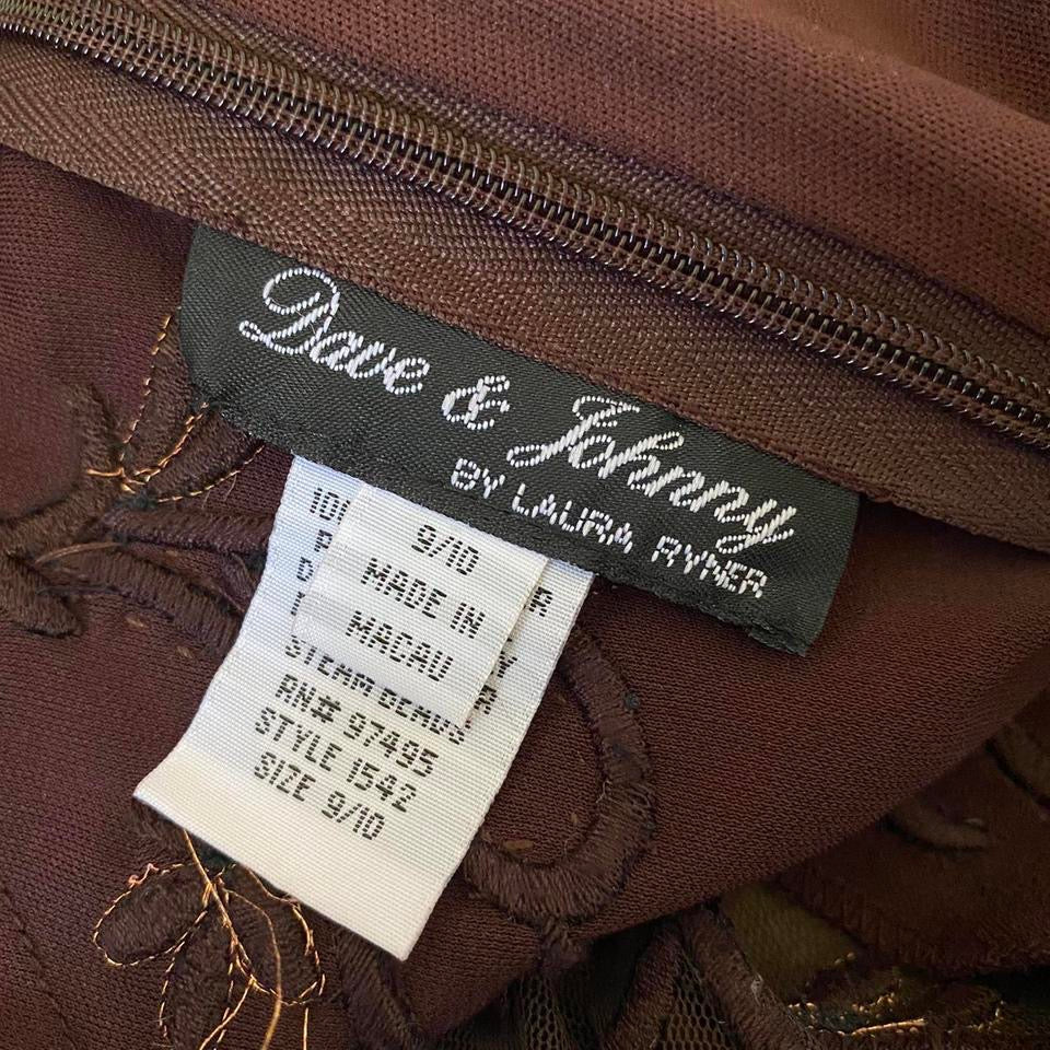 Brown stretch evening dress gown with floral lace detailing to the back & bust, a sheer trail & back & a zip up the side UK 12