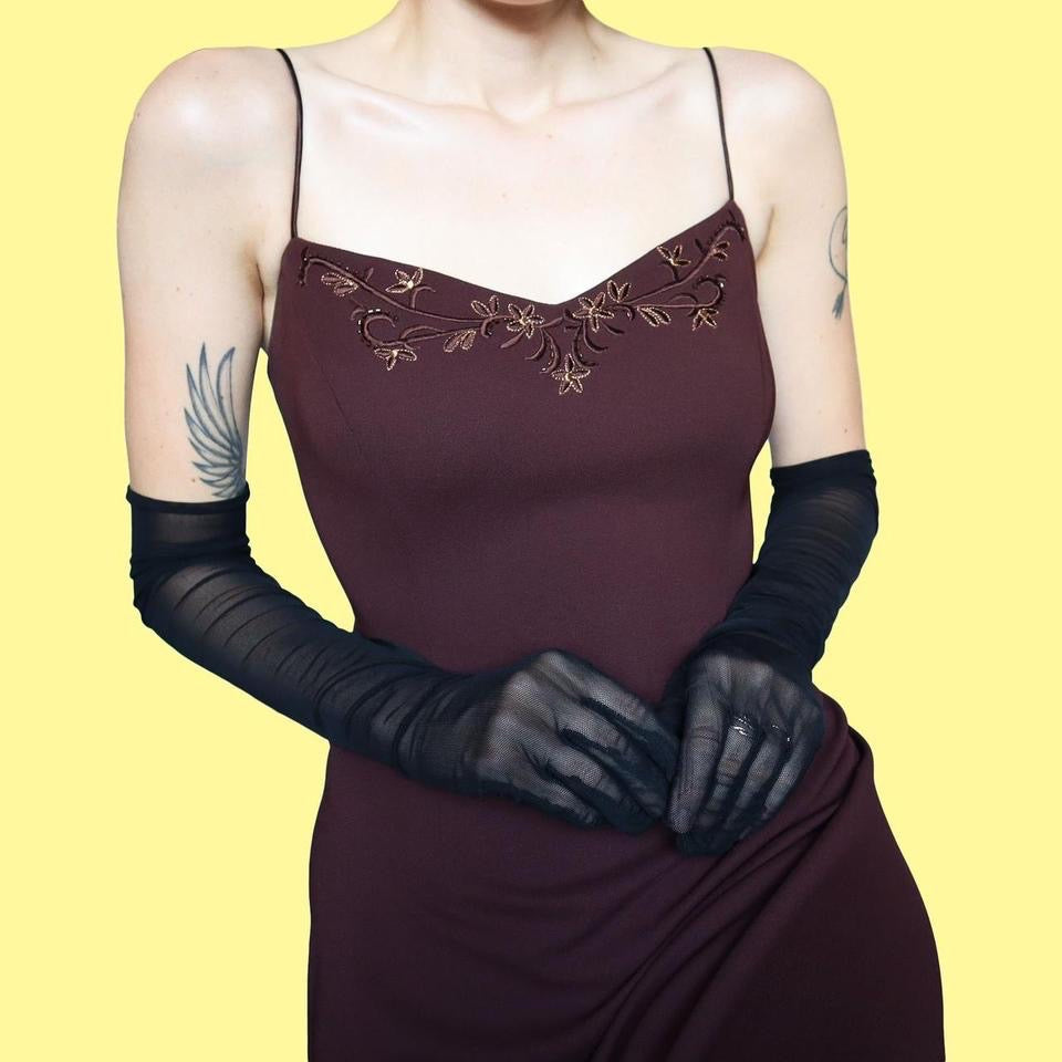 Brown stretch evening dress gown with floral lace detailing to the back & bust, a sheer trail & back & a zip up the side UK 12-14