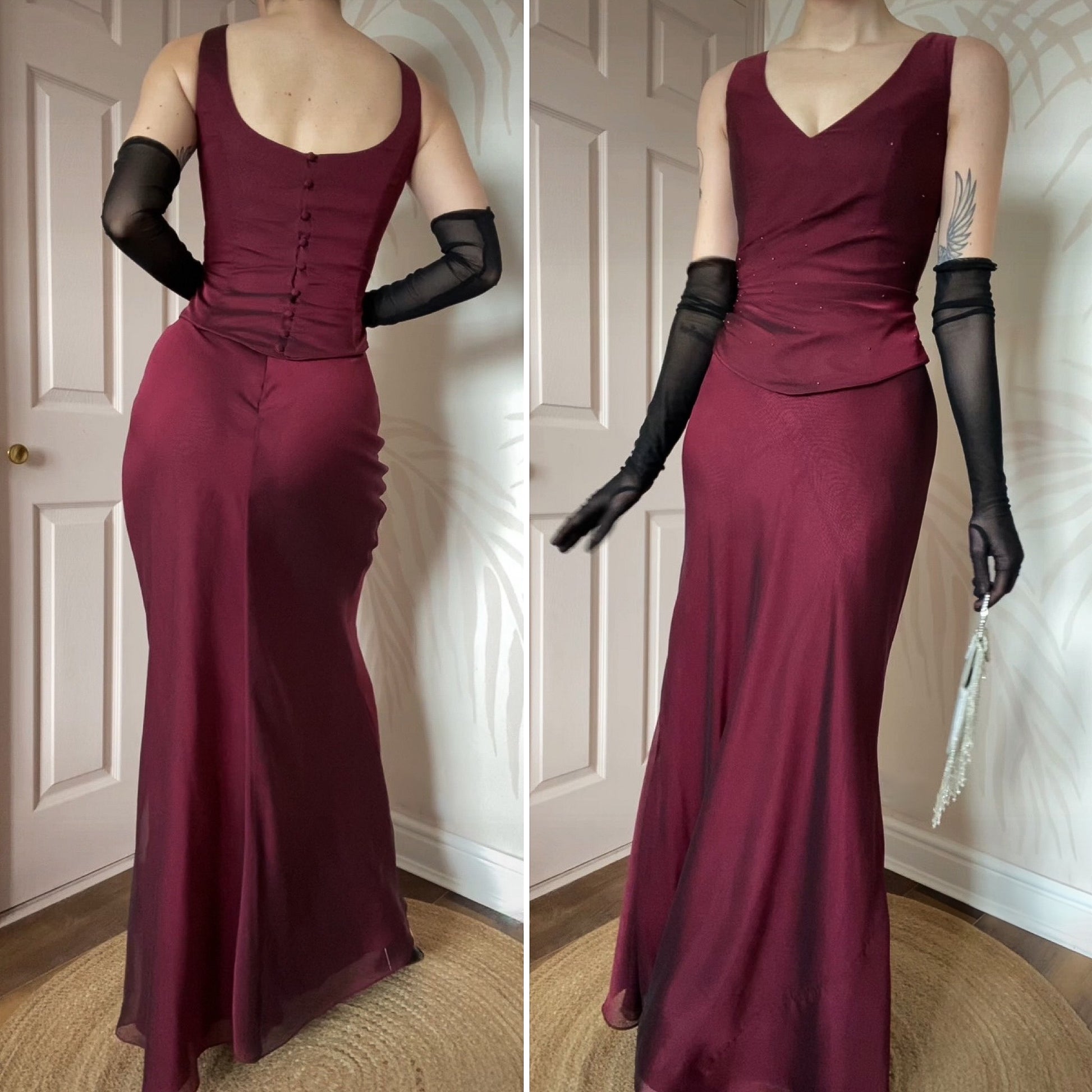 Burgundy 2 piece top & skirt prom set - the top is beaded & boned with button fastenings at the back - the skirt is high waist with a zip fastening at the back UK 14 & 16