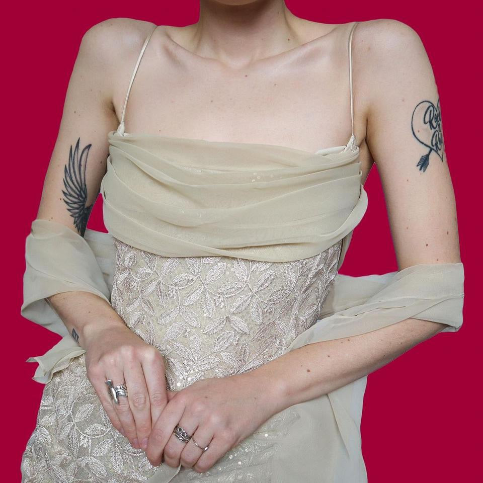 🌹Champagne lace & sequin lining evening dress with a cowl chiffon neckline, lace up back, a zip up the back & matching shawl UK 16🌹