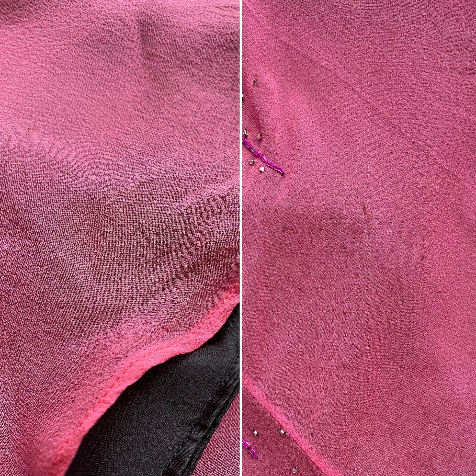 100% silk pink ombre halter-neck heavily beaded evening dress with hook & eye fastenings at the back of the neck, a padded bust & a zip up the back uk 8