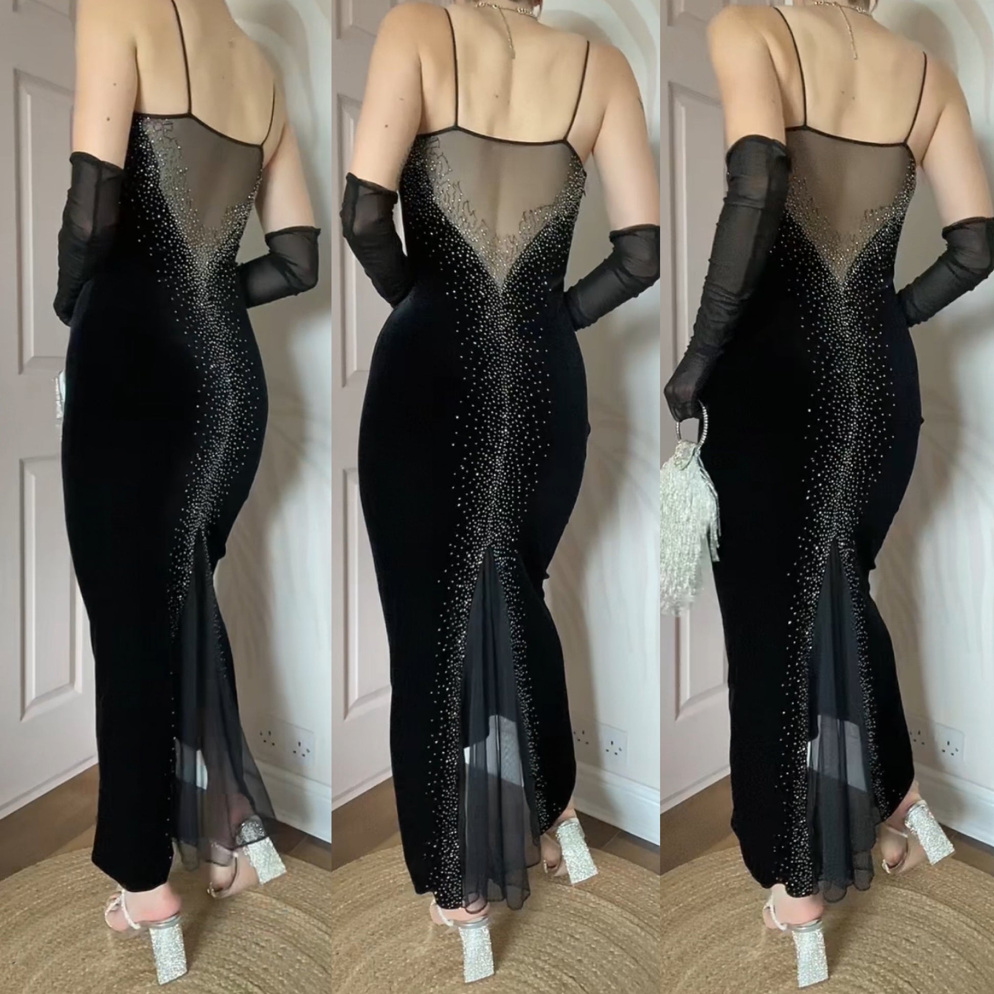 🌹Black velvet evening dress UK 8-10 & 12🌹Chic black velvet stretch beaded prom dress with a sheer back, sheer cut out trail at the back bottom hem & a zip up the side🌹