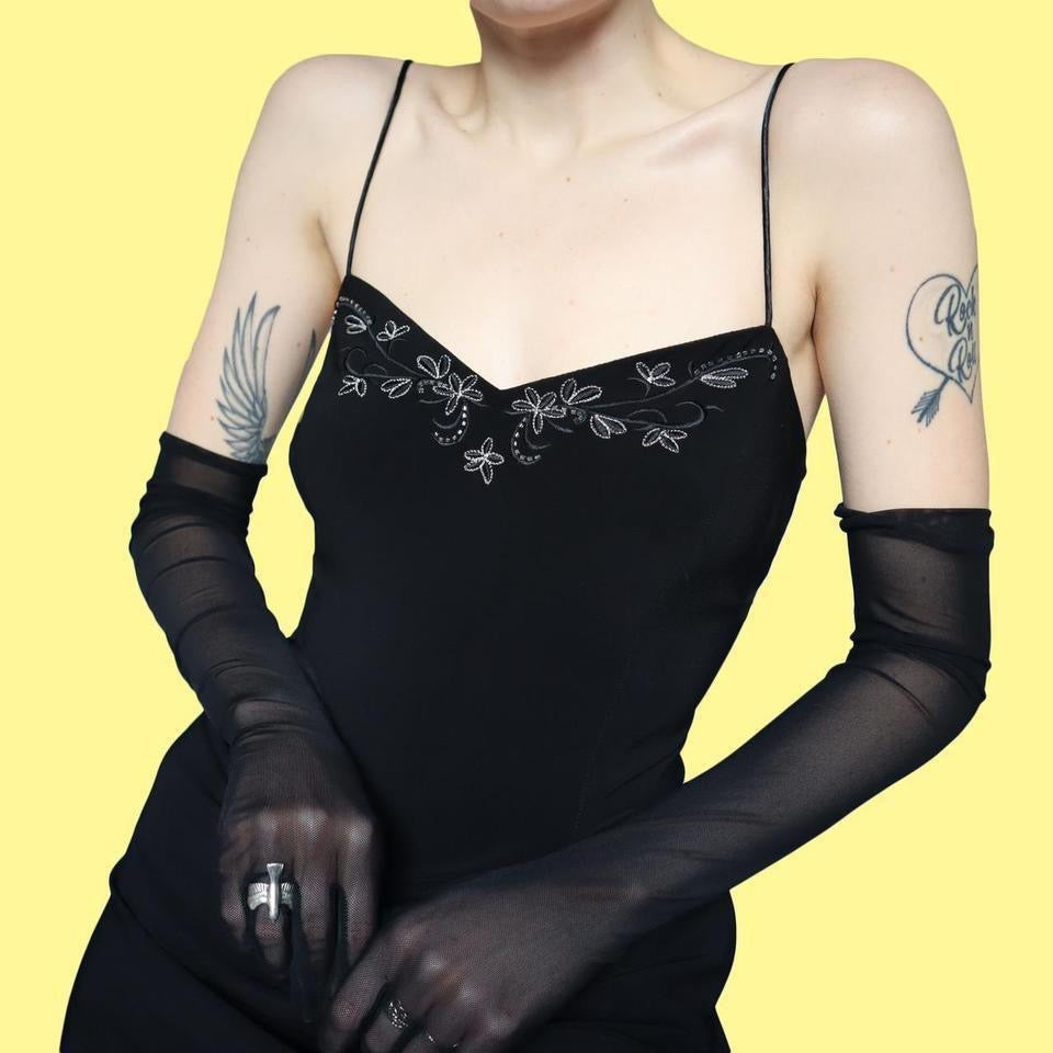 Black 90s stretch floral embroidered evening dress UK 14