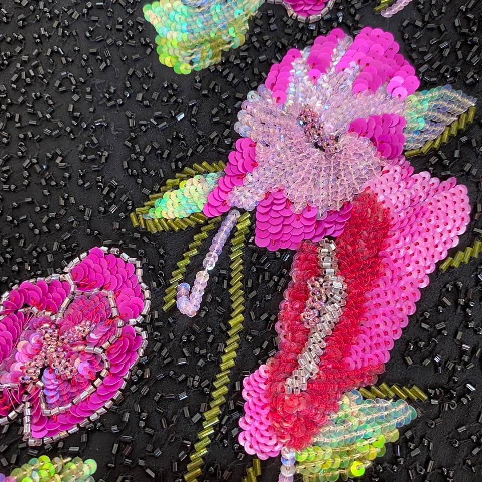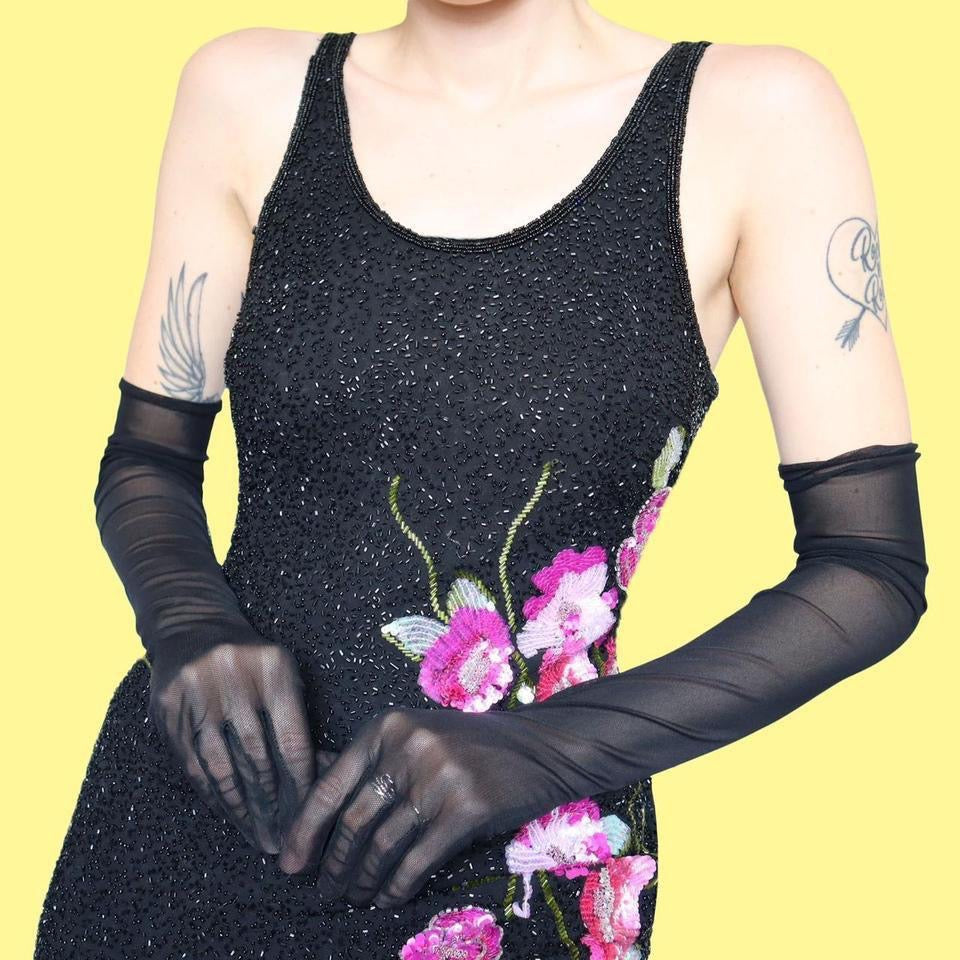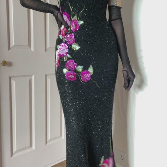 🌹Black heavily beaded evening dress with floral detailing & a zip up the side UK 12🌹