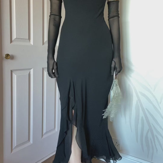 🌹Black chiffon evening dress with a diamanté buckle strap detail, a cowl neckline, a zip up one side & a slit up one leg UK 12🌹