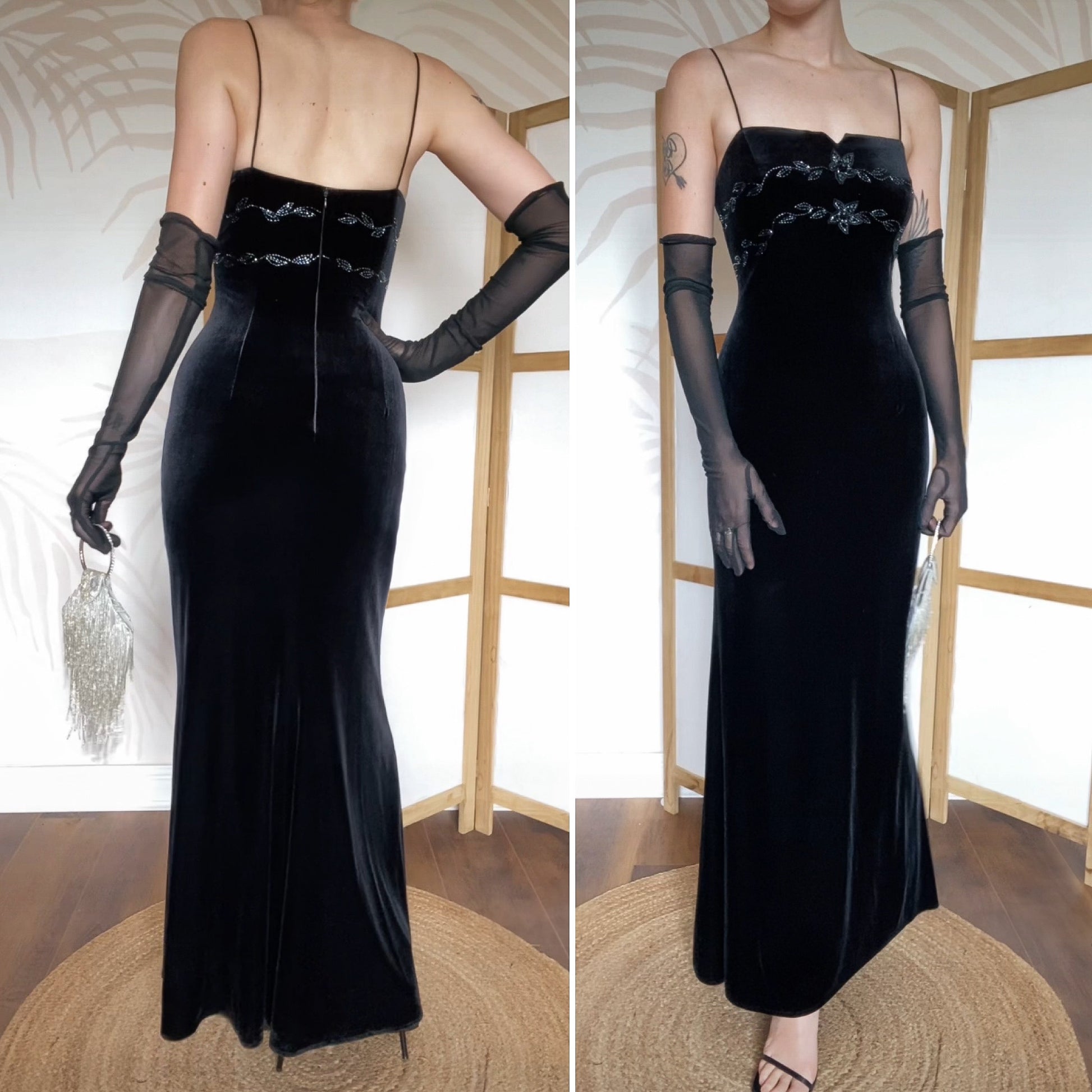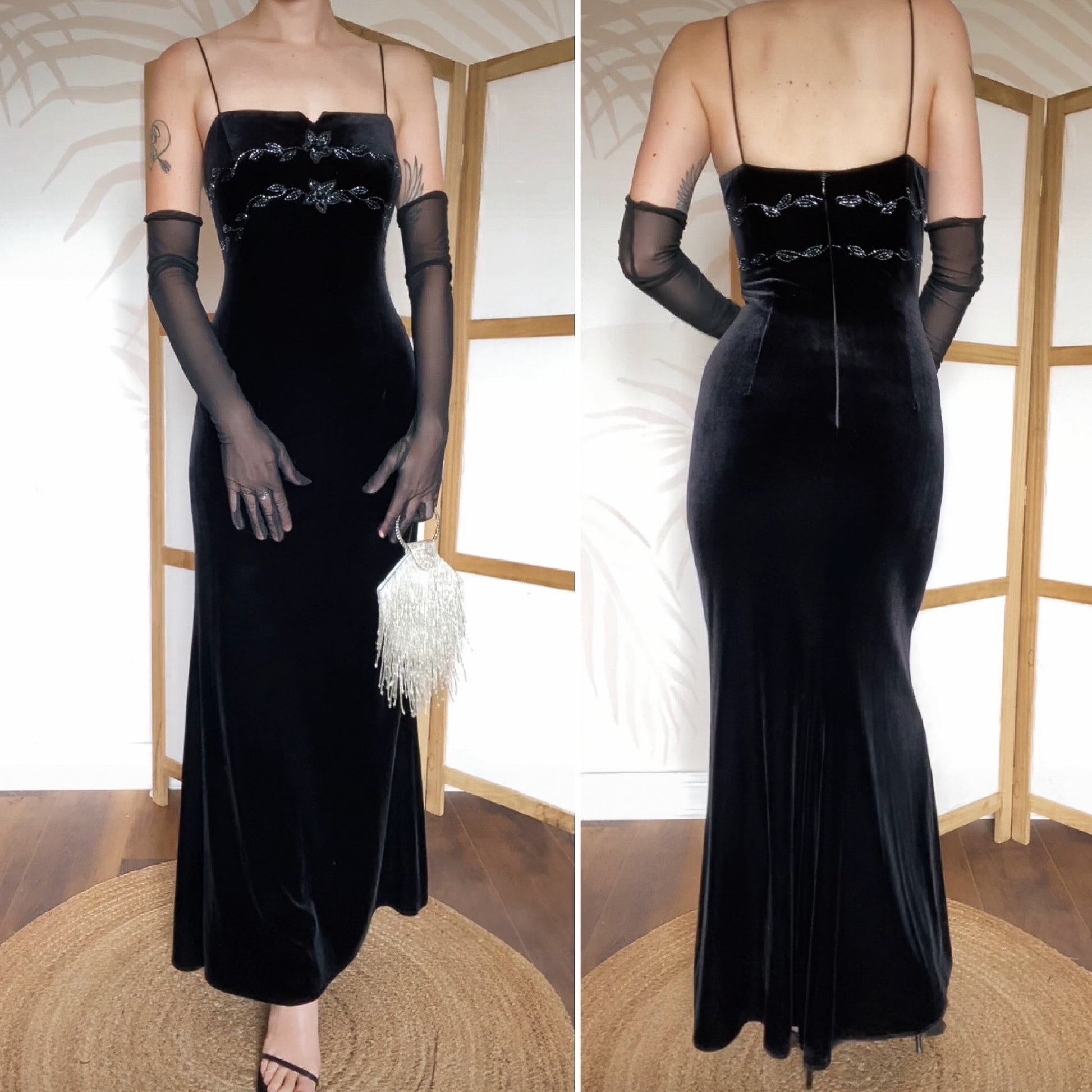 Black velvet stretch evening dress with a beaded bust & back & a zip up the back uk 12