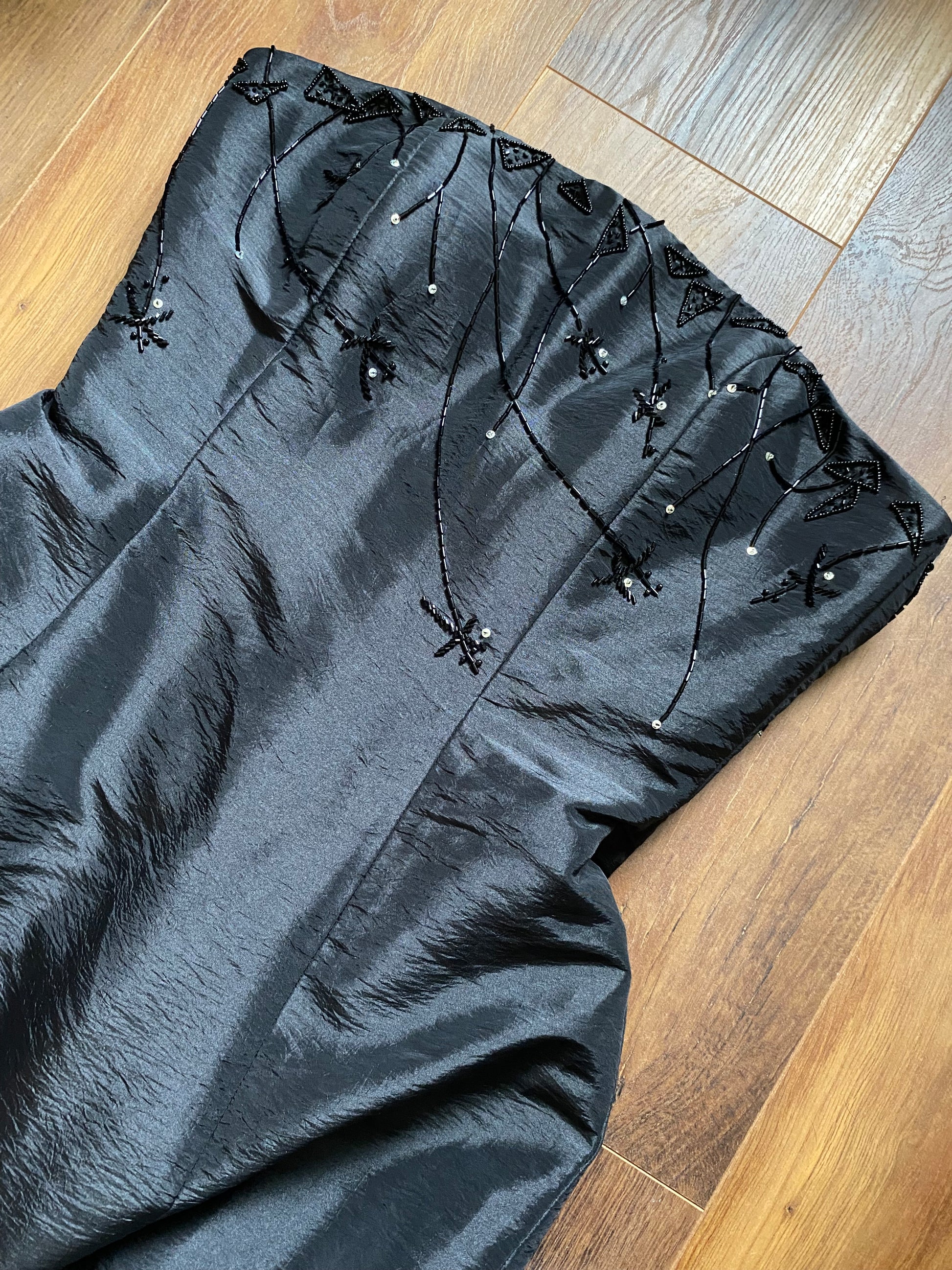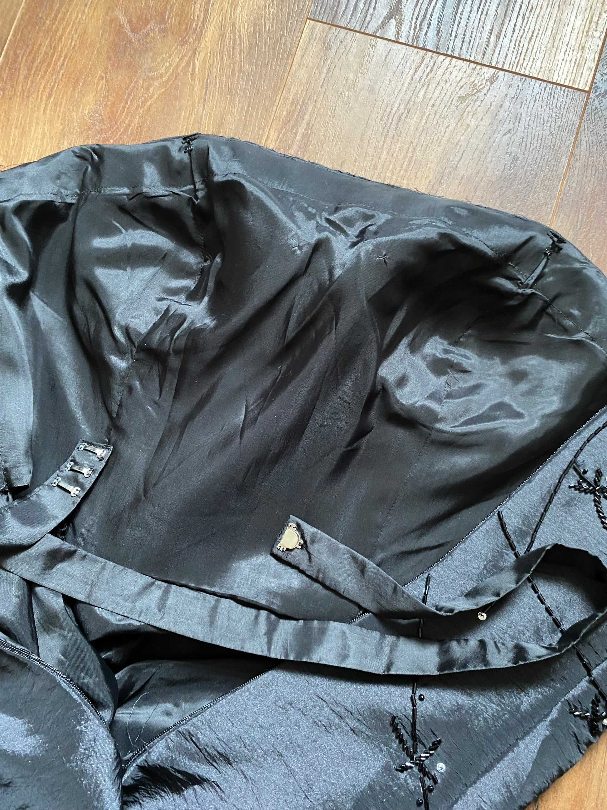 Black strapless fit & flare evening gown with bead & sequin detailing, a netted underskirt to hold the shape of the dress, a padded bust, a strap inside to help hold the dress up & a zip up the back UK 14