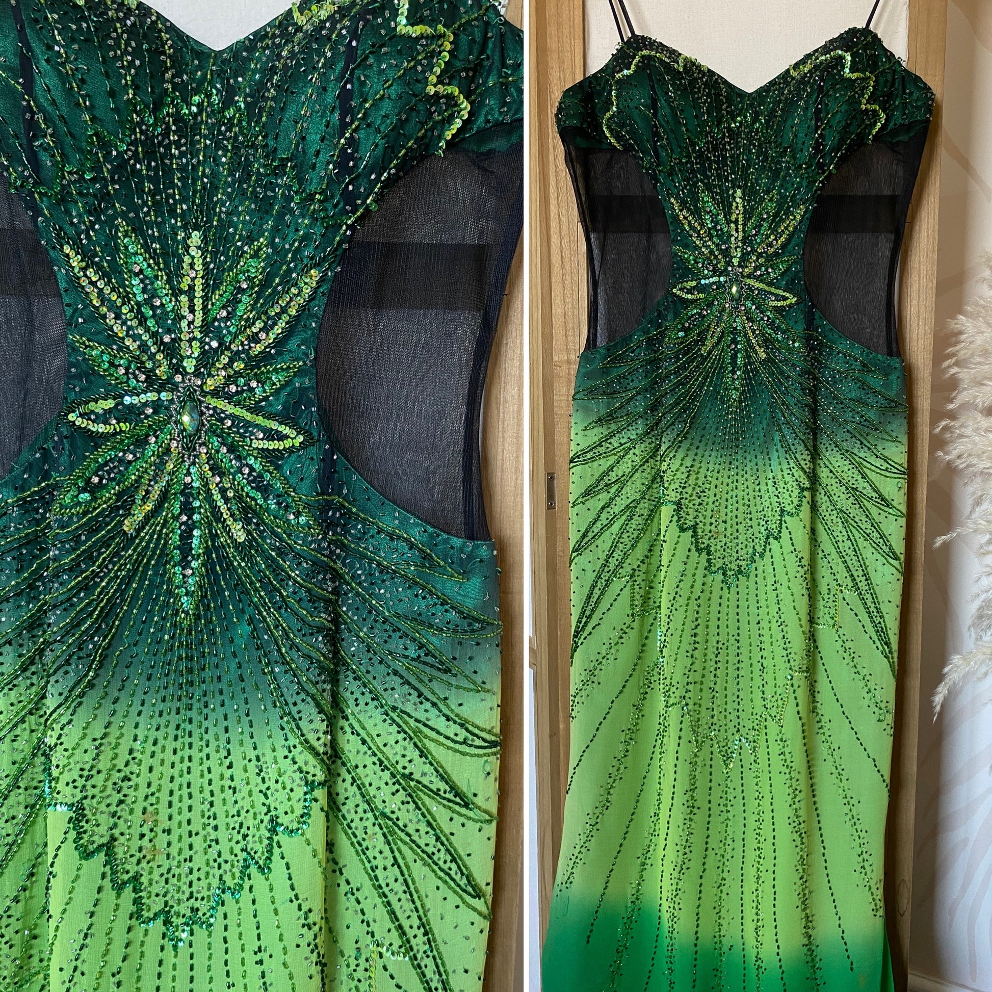 Green 100% silk beaded evening dress with sheer panelled waist panels, a padded bust, a slit up one side & a zip up the back uk 10
