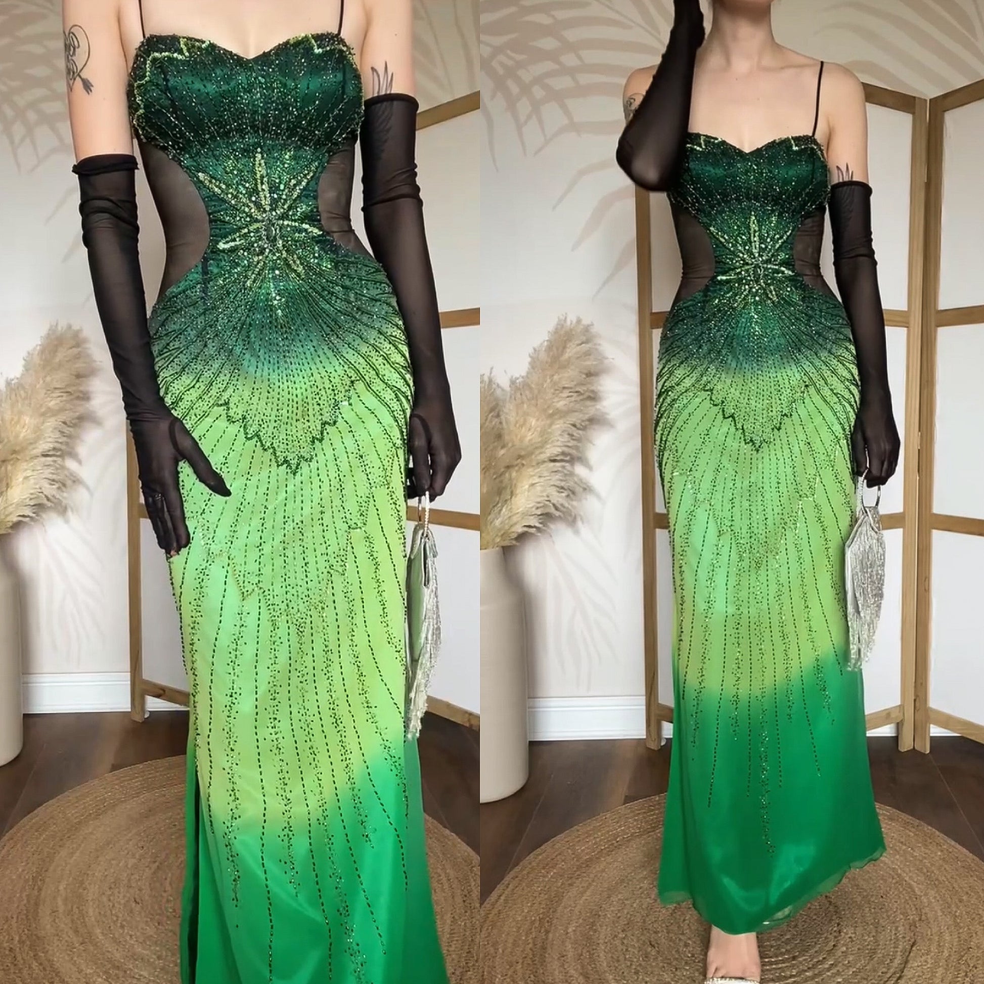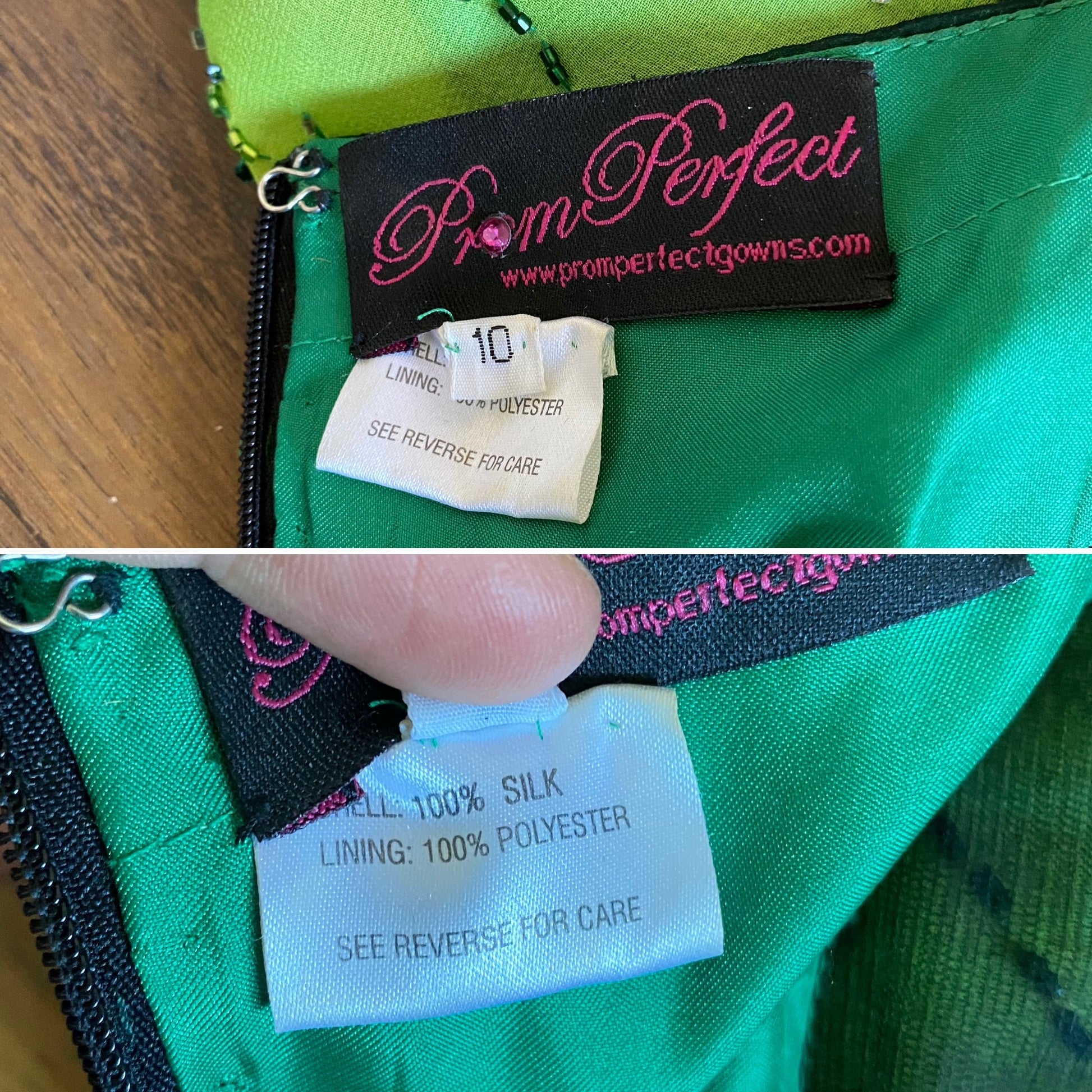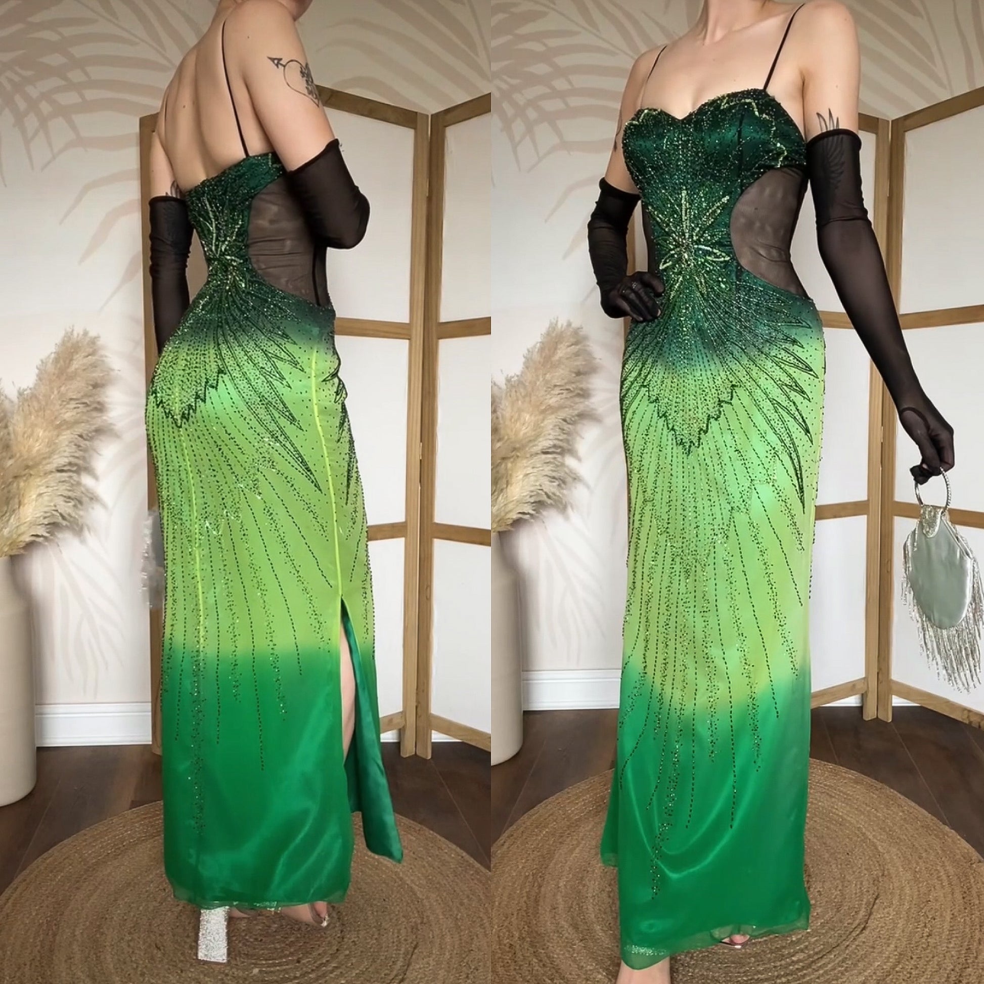 Green pure silk beaded prom dress uk 10