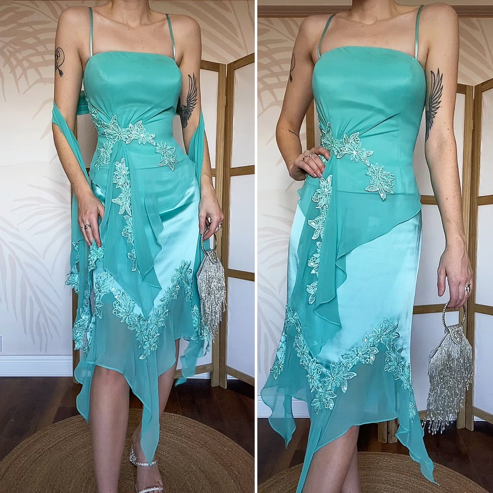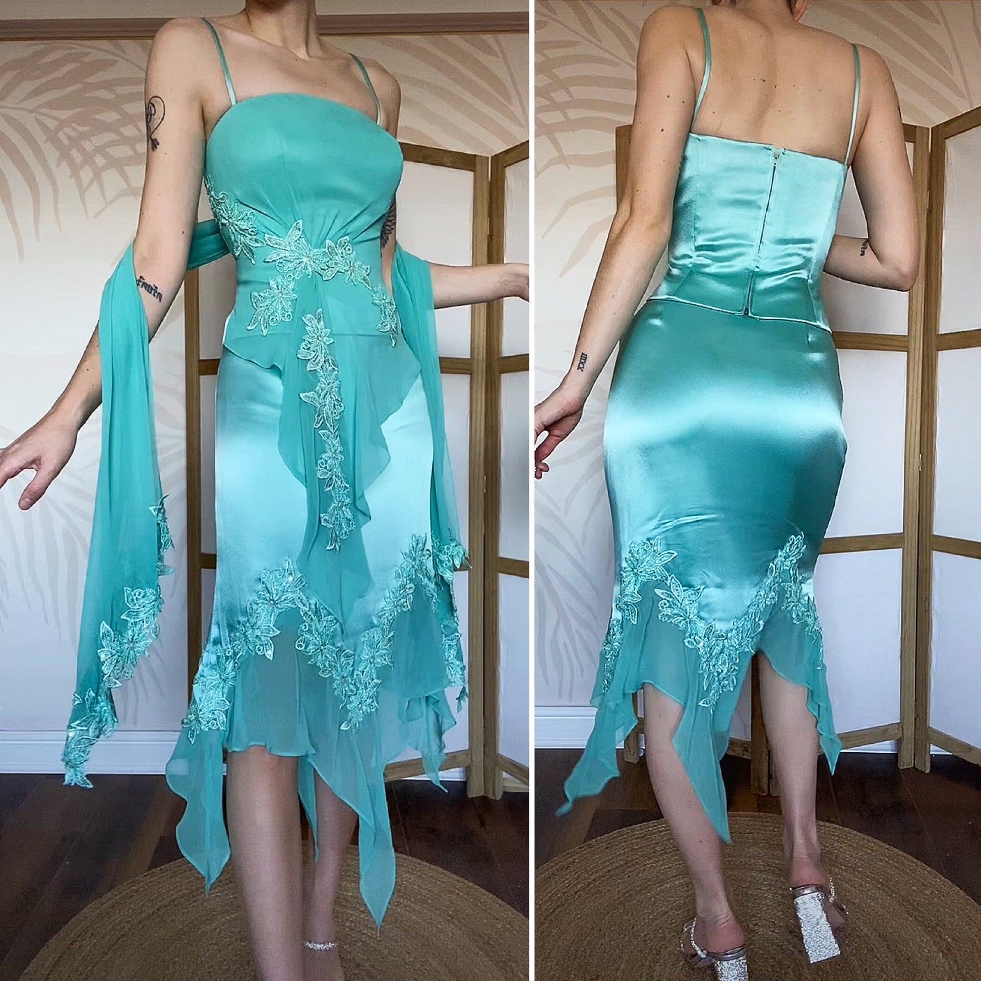 Designer John Charles sapphire 3-piece skirt top & shawl set UK 14 - the top has a padded bust, floral & sequin detailing & a zip up the back - the skirt is midi with a chiffon handkerchief hem & a zip up the side