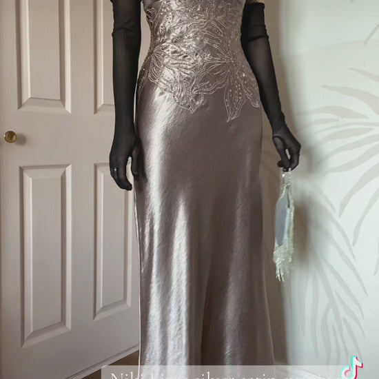 Stunning shimmery evening dress with floral embroidered & sequin waist detail, longer trail at the back, lace up back & a zip up the back UK 10