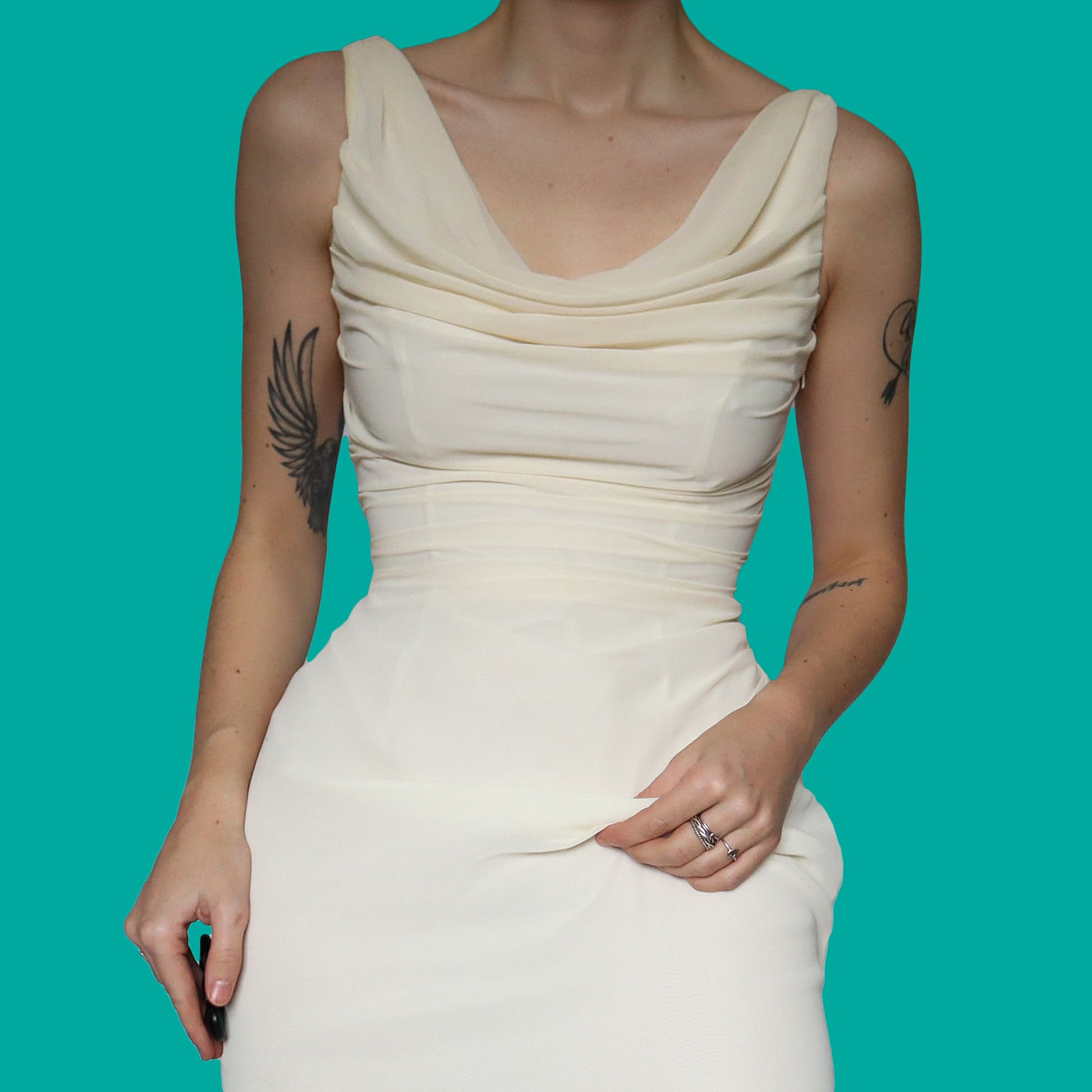 🌹Beautiful cream draped chiffon evening dress with a slit down one side & a zip up one side UK 10🌹