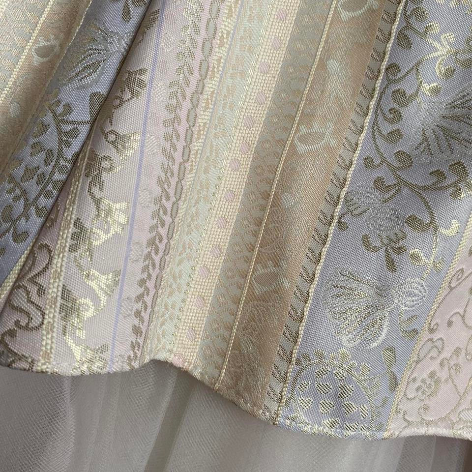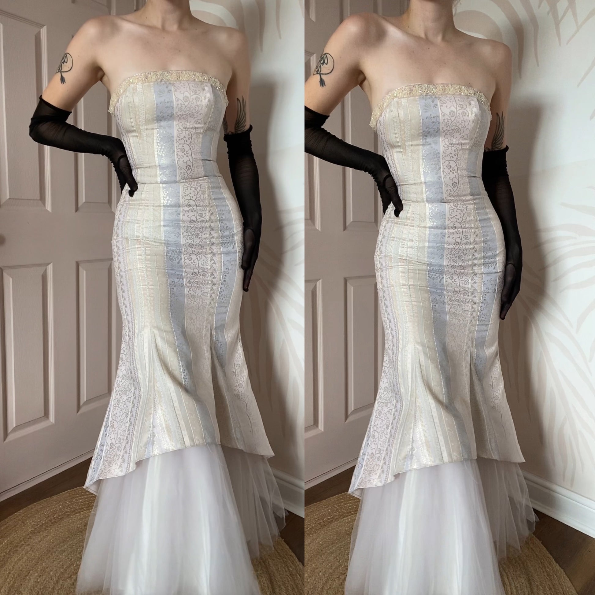 Cream strapless evening gown with a boned bust, bead detailing around the neckline, a tulle fishtail hem, beautiful print fabric & a zip up the back UK 8