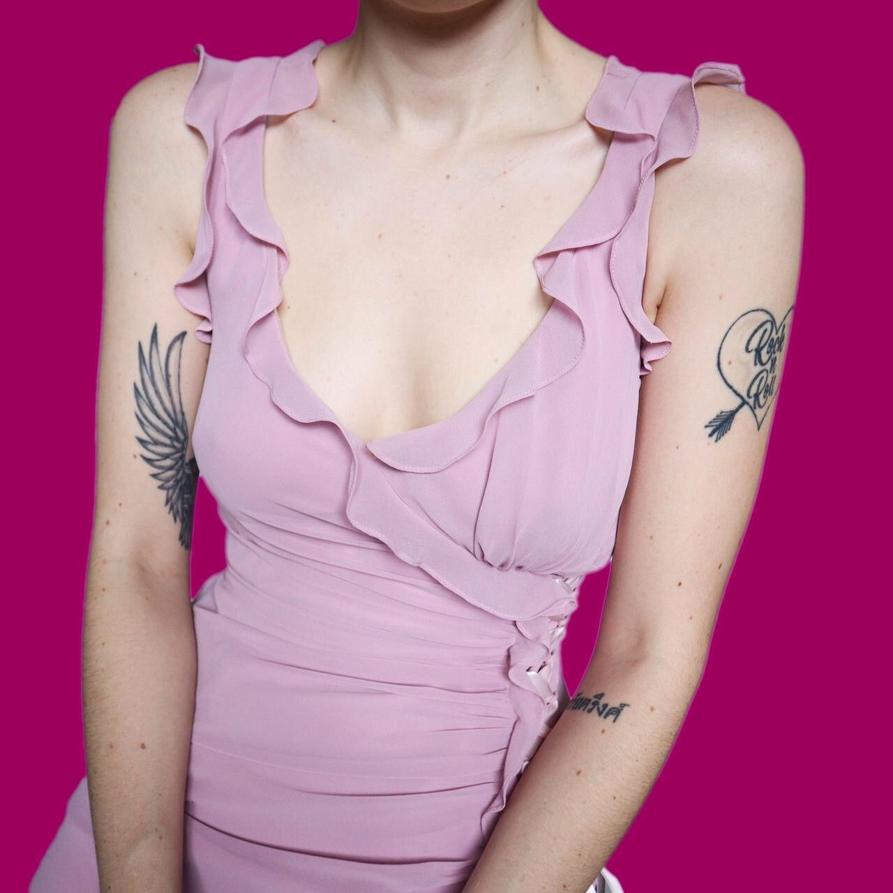 🌹Super cute frilly dusky pink midi dress with slightly longer trail at the back, a lace up ribbon side & a zip up the side UK 10🌹