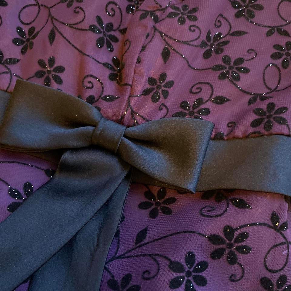 Dark purple floral glittery halter neck evening dress with slightly flared hem, bow front detail, a hook & eye fastening at the back of the neck & a zip up the back UK 10