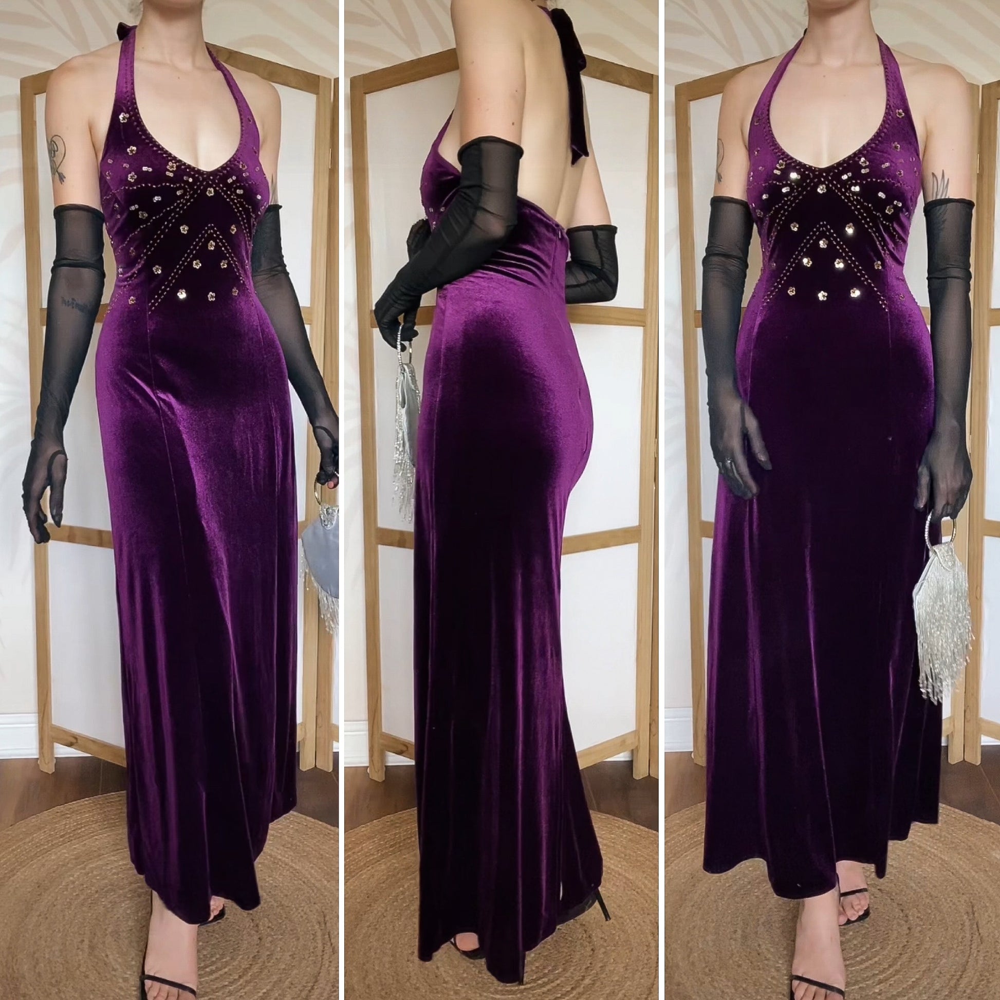Dark purple stretch halter-neck evening dress with gold sequin & bead detailing to the waist & bust, a tie at the back of the neck, elastic at the back & a zip up the back uk 12