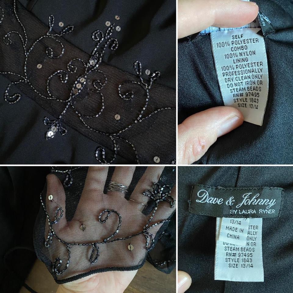 Black stretch sheer waist & back evening dress with beaded detailing, a fishtail hem & a zip up one side uk 14