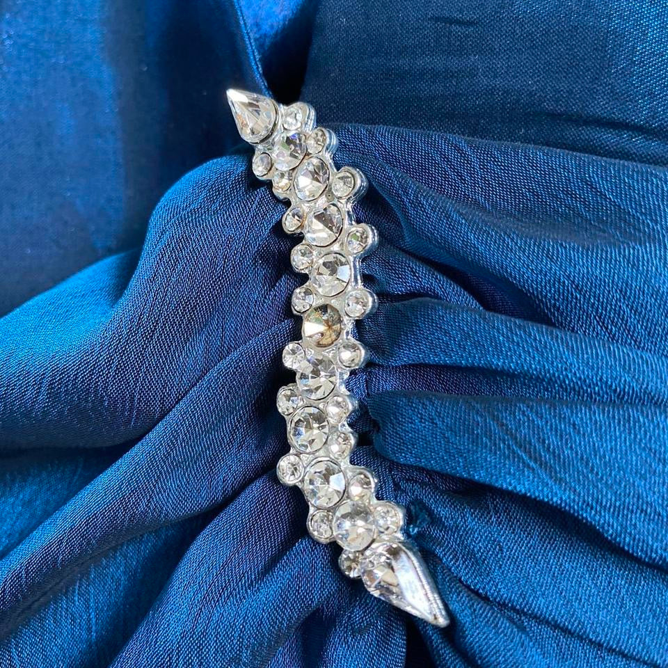Shimmery blue petite evening gown with a chiffon trail down the back, diamanté detail to the bust & a zip up the back UK 12