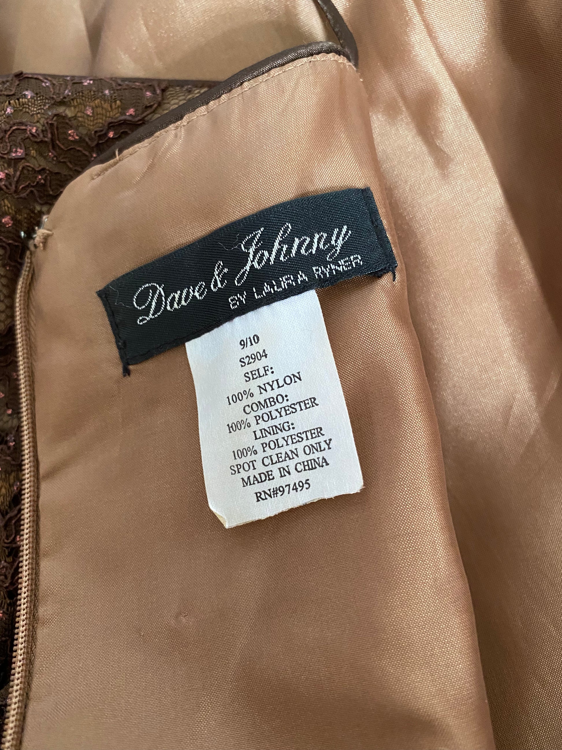 🌹Beautiful brown glittery lace evening dress with a silky golden lining showing through, a boned bust & waist, a lighty flared hem & a zip up the back UK 12🌹