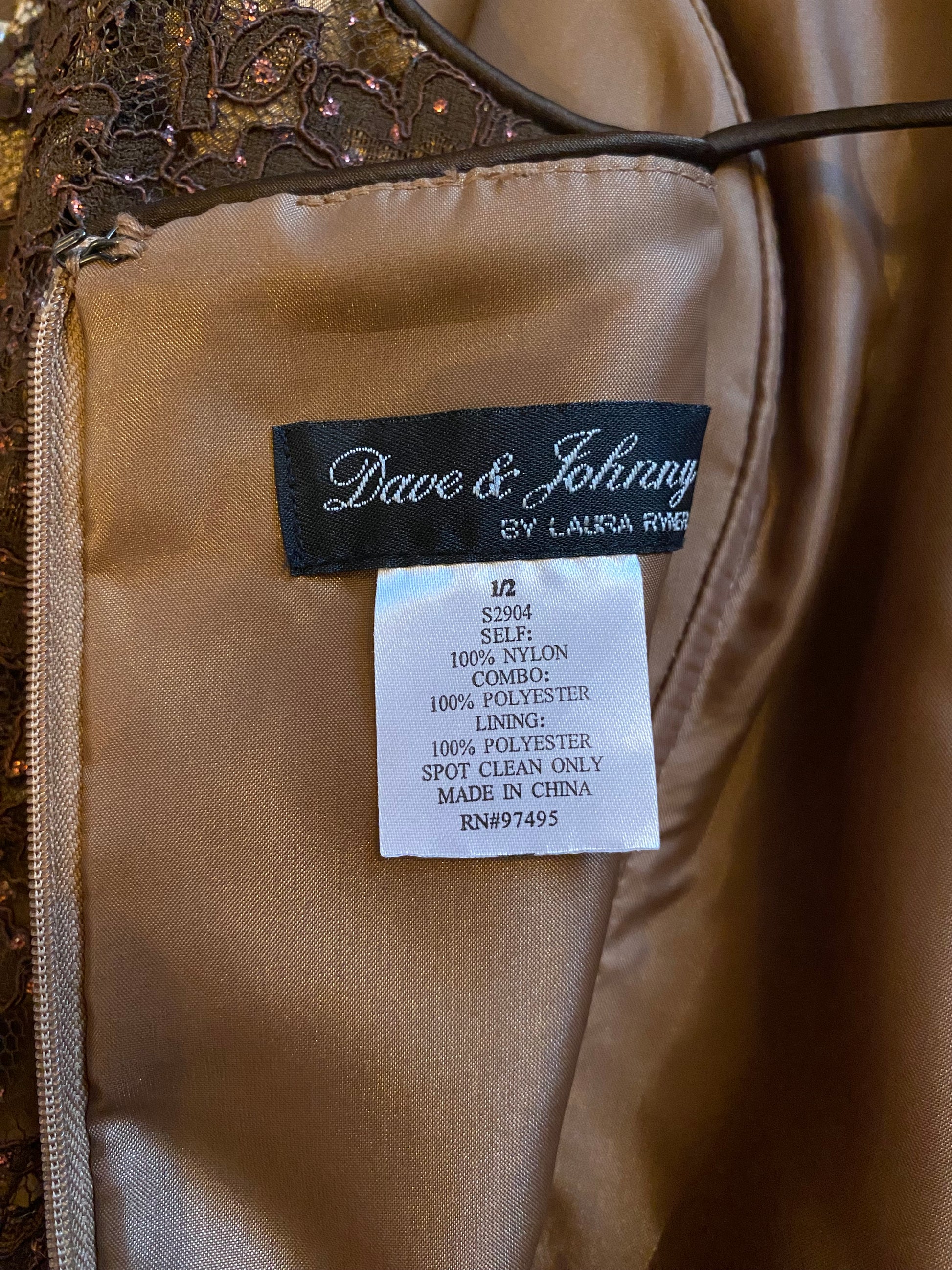🌹Beautiful brown glittery lace evening dress with a silky golden lining showing through, a boned bust & waist, a lighty flared hem & a zip up the back UK 6🌹