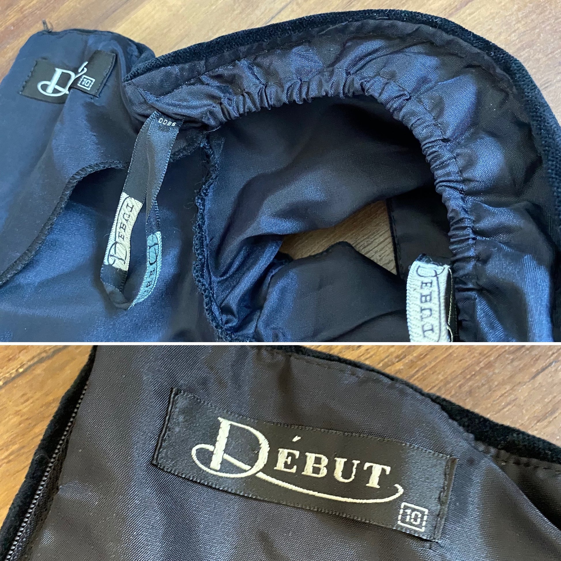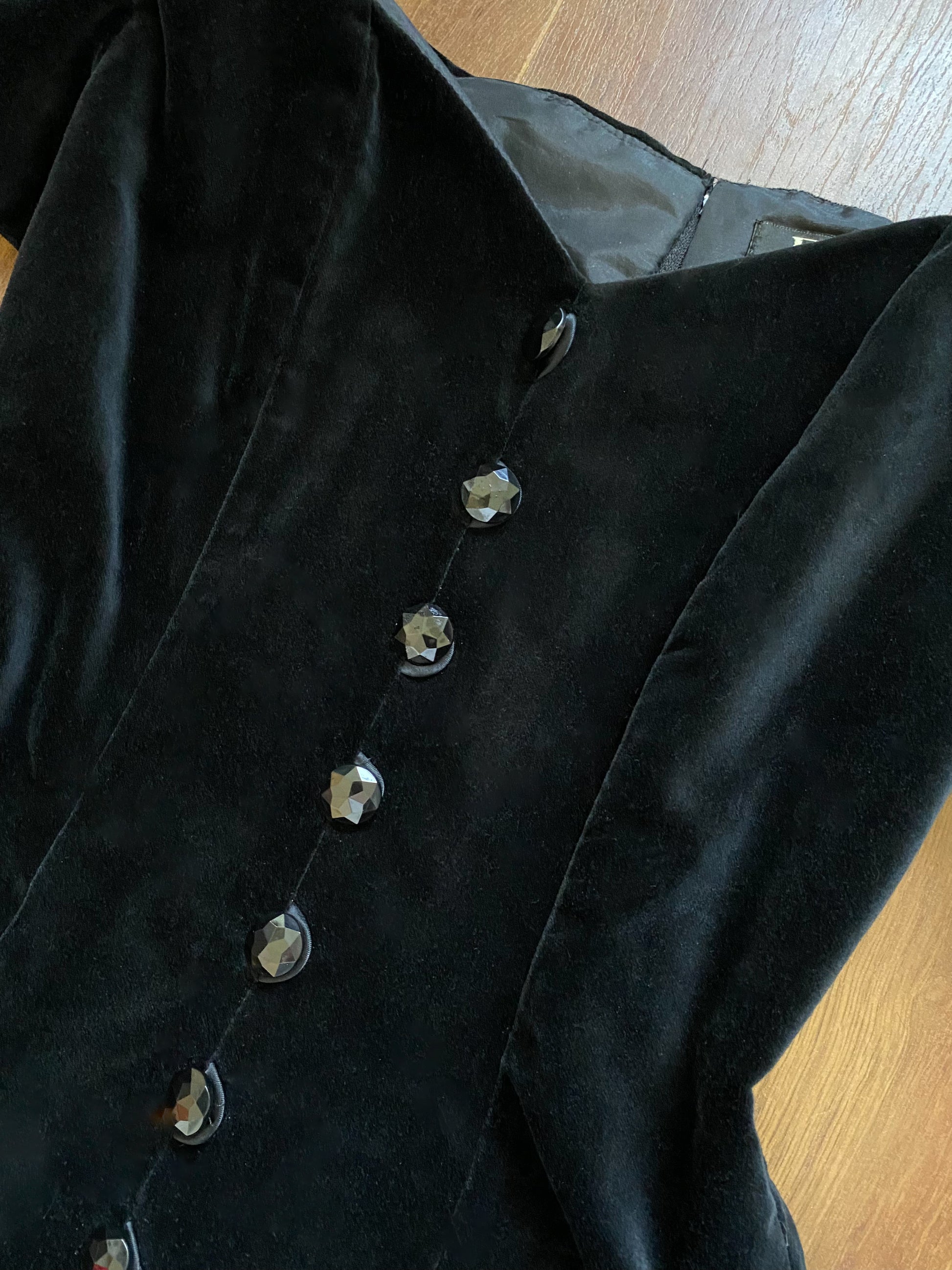 Black velvet Debut cold shoulder fitted evening dress with a gold satin lining, boning to the bust & waist, button detailing down the front, elastic at the shoulders to help keep the dress up, a zip up the back & matching shawl uk 12