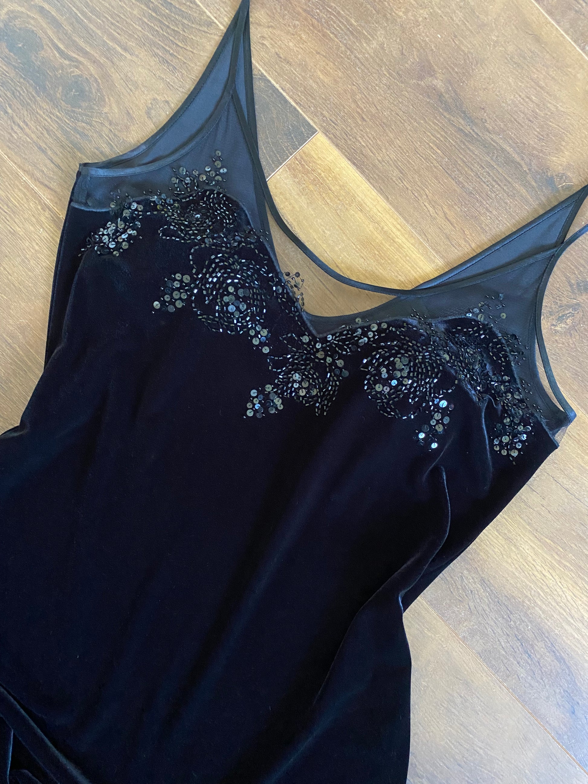 Chic black velvet stretch Debut evening dress with a padded bust, bead & sheer bust detailing & a slit up one side uk 14
