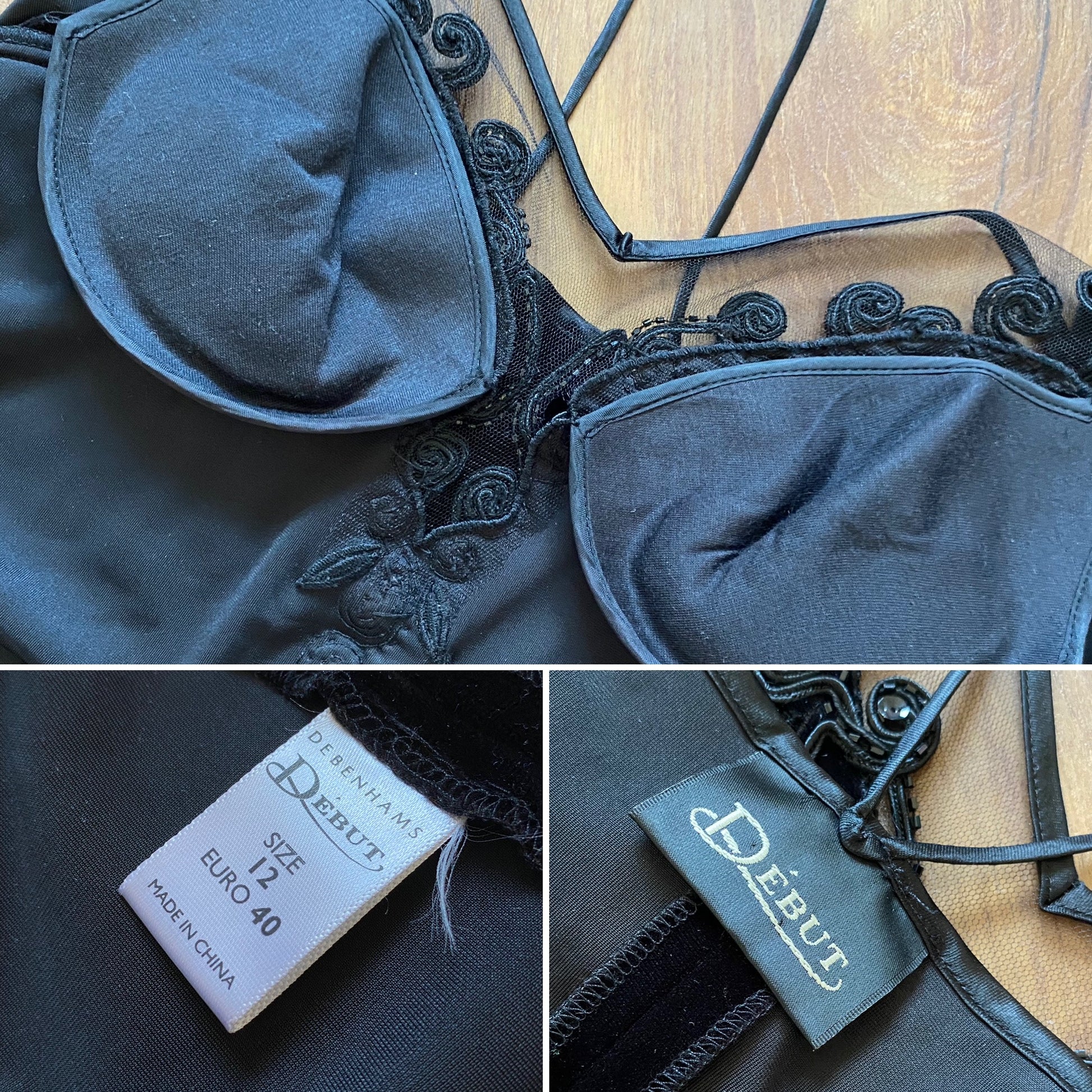 Black velvet stretch slip evening dress with a padded bust, sheer bust & bead detail UK 12