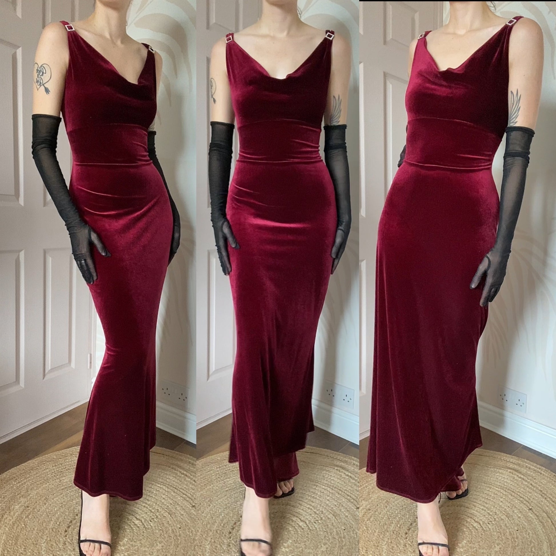 🌹Dark red velvet stretch evening dress with longer trail down the back, diamanté detail straps & a cowl neckline UK 12🌹PLEASE NOTE: the gloves are not included🌹