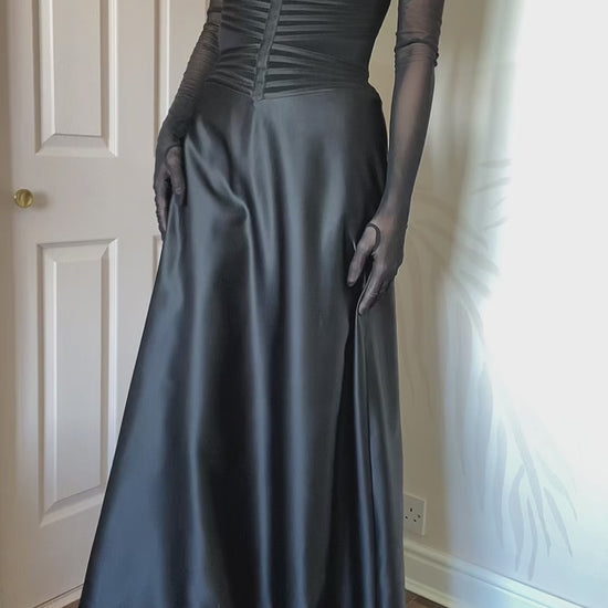 Stunning vintage designer Tadashi black evening gown with a light padded bust, a-line shape & a zip up the back UK 10