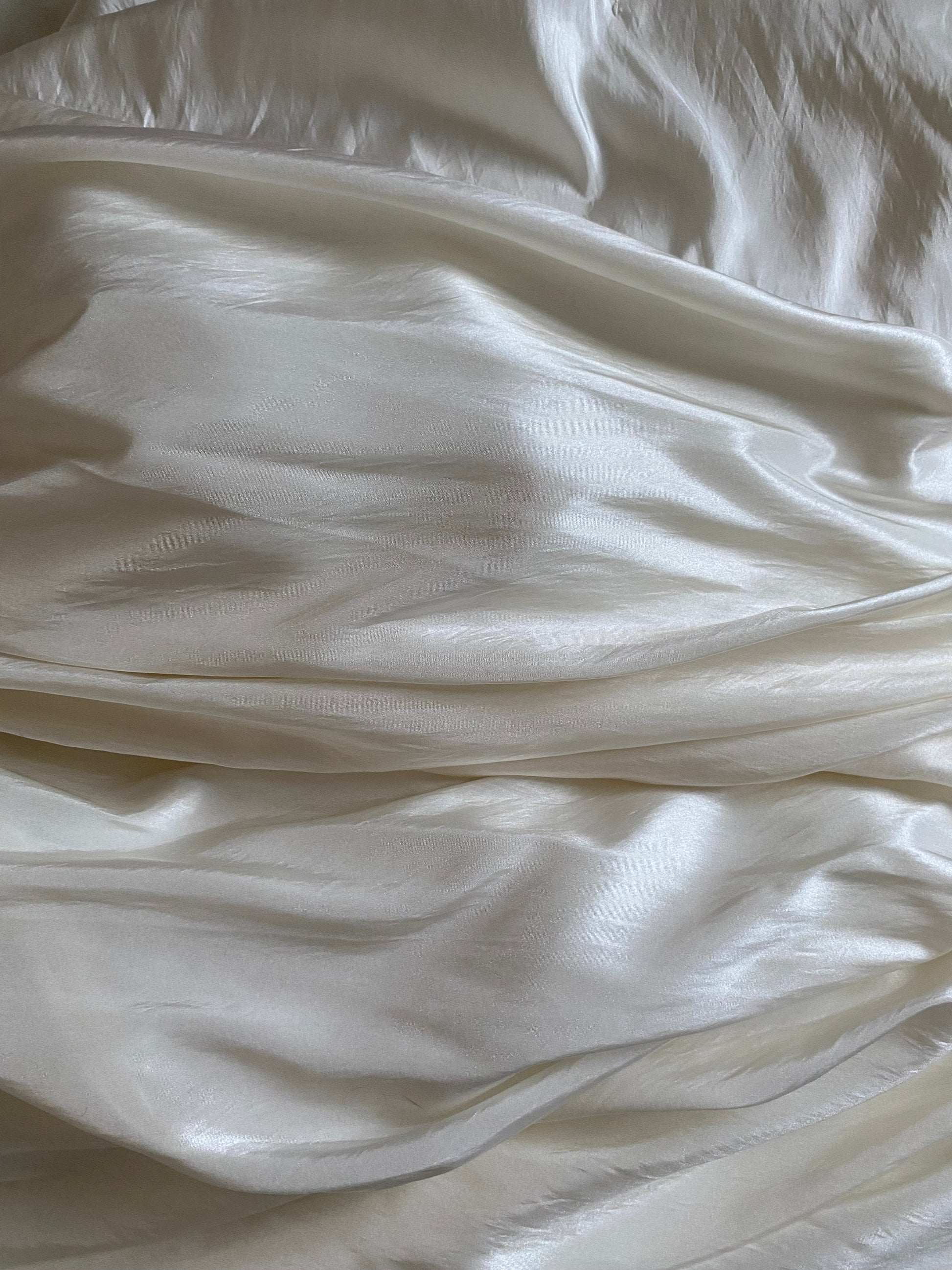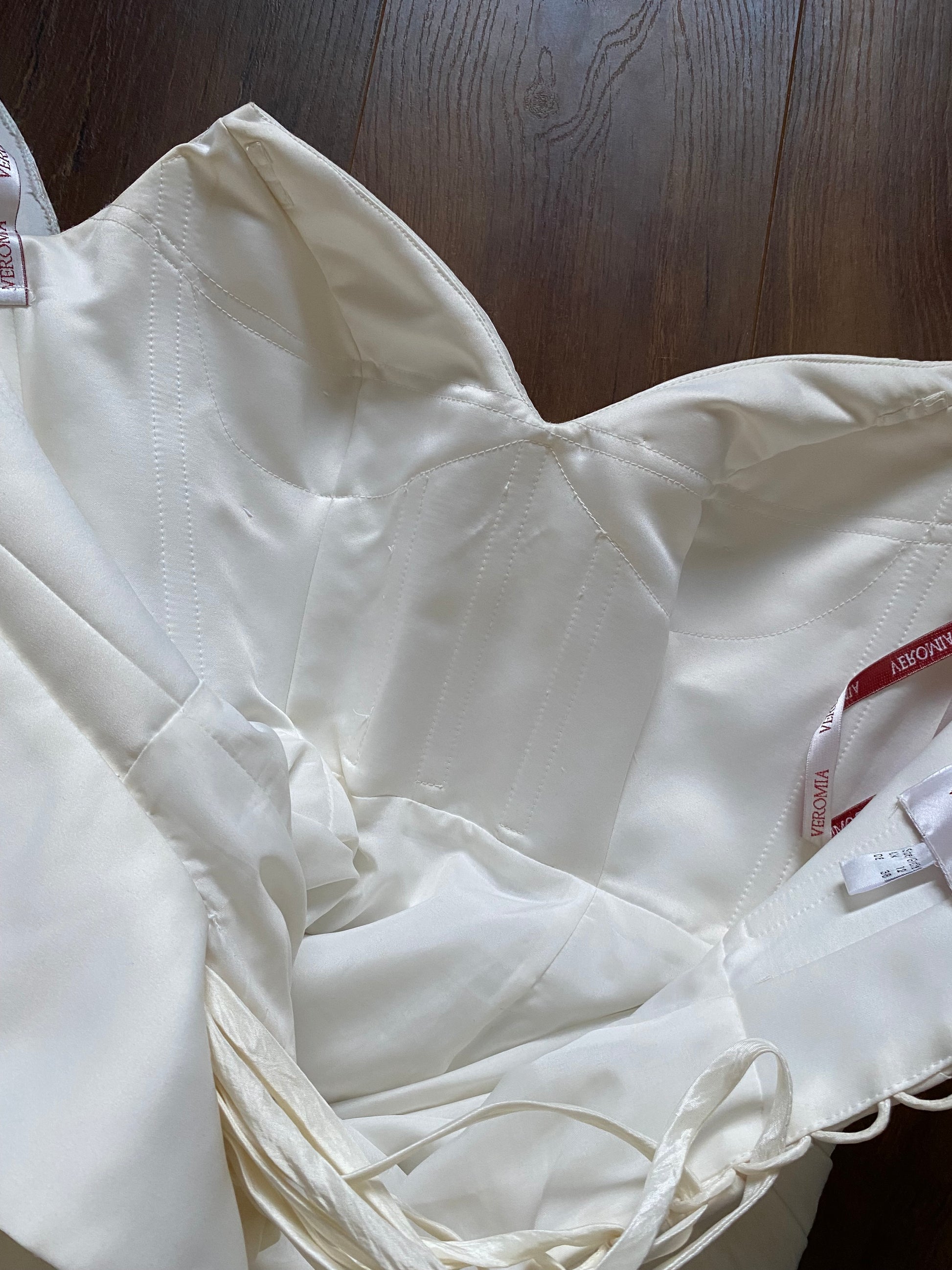 Stunning Veromia strapless wedding gown with a draped a-line hem, floral & bead detailing, a padded bust, a structured bust and waist with a lace up adjustable back, a detachable privacy screen & a zip up the back - the dress has a longer train down the back UK 12