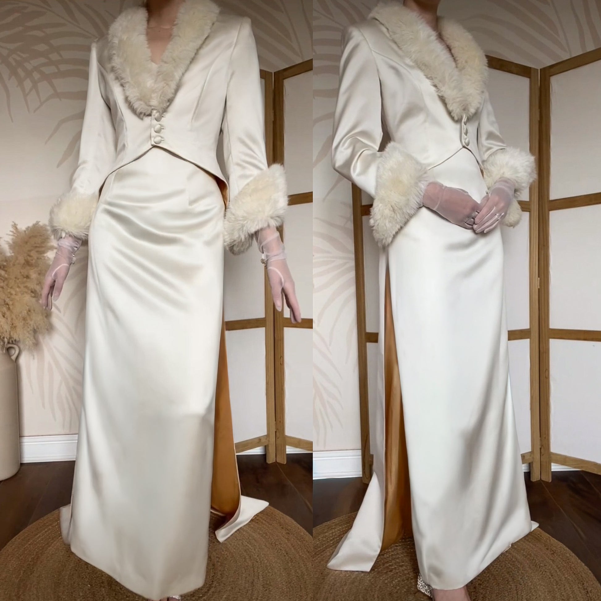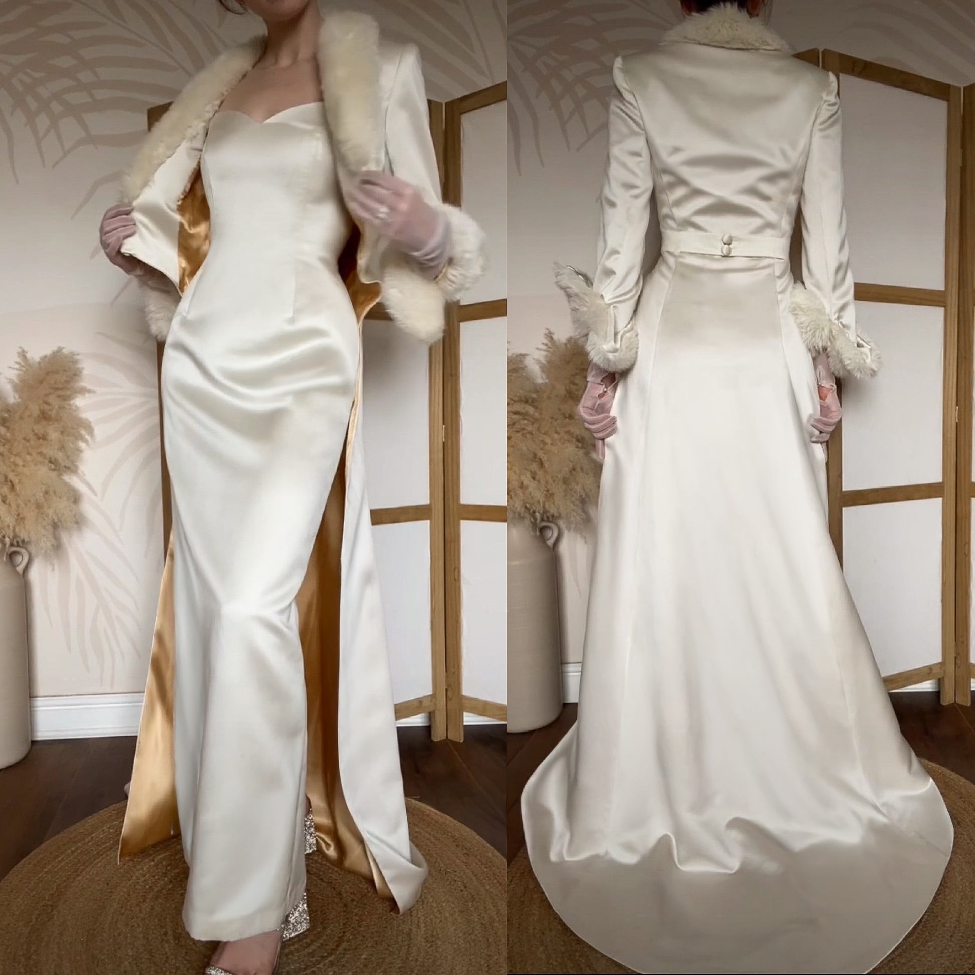 Beautiful ivory 2-piece Ellis wedding dress and coat - the dress is a simple sleek design with a slit up the back & a zip up the back - the coat is cropped with a long train down the back, a gold lining showing, a faux fur trim, button front fastening & shoulder pads uk 12