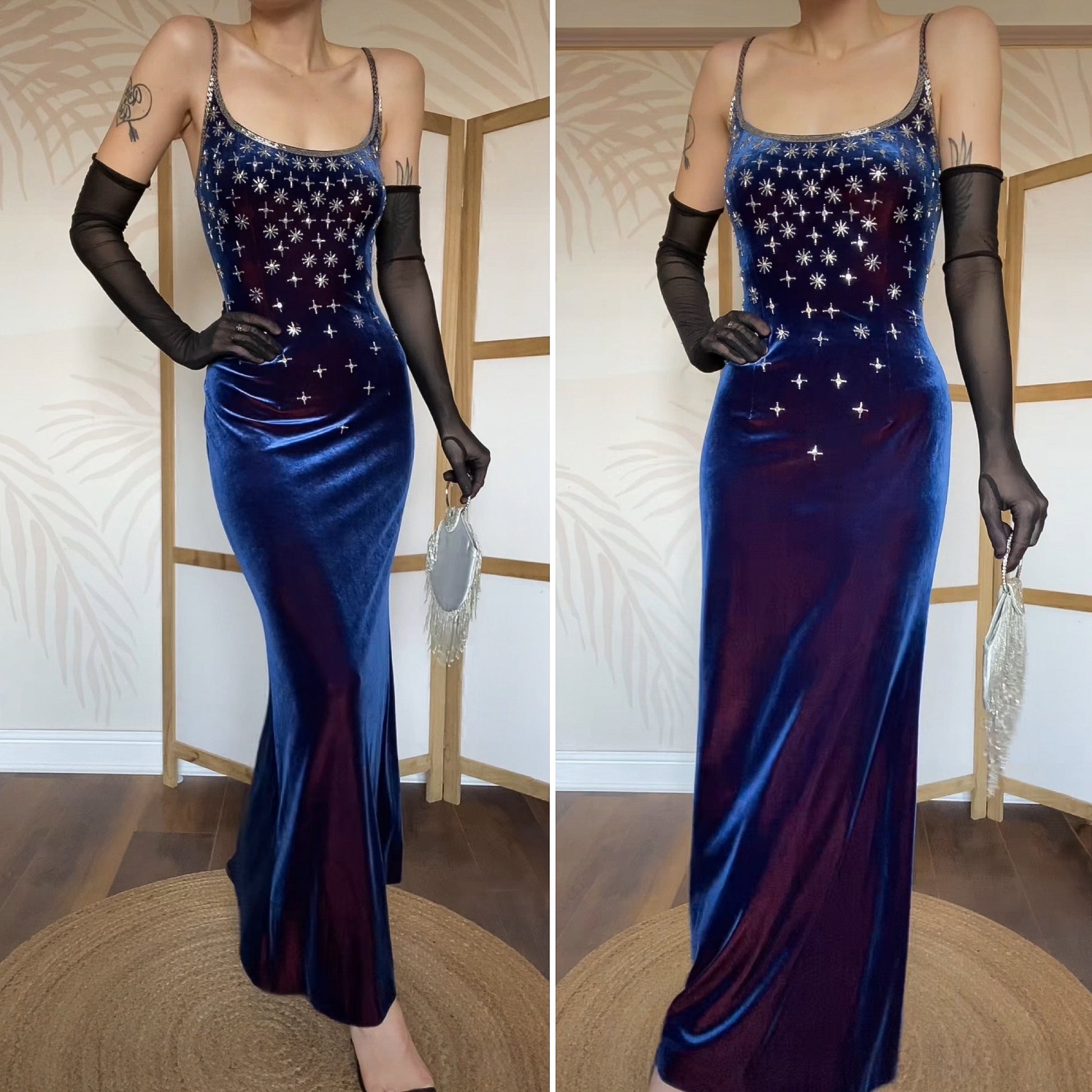 Blue iridescent velvet stretch evening dress with silver detail beading & a zip up the back UK 12