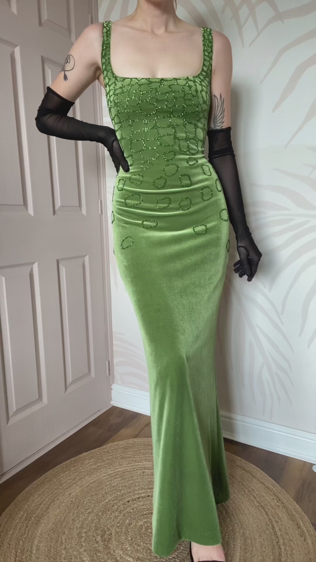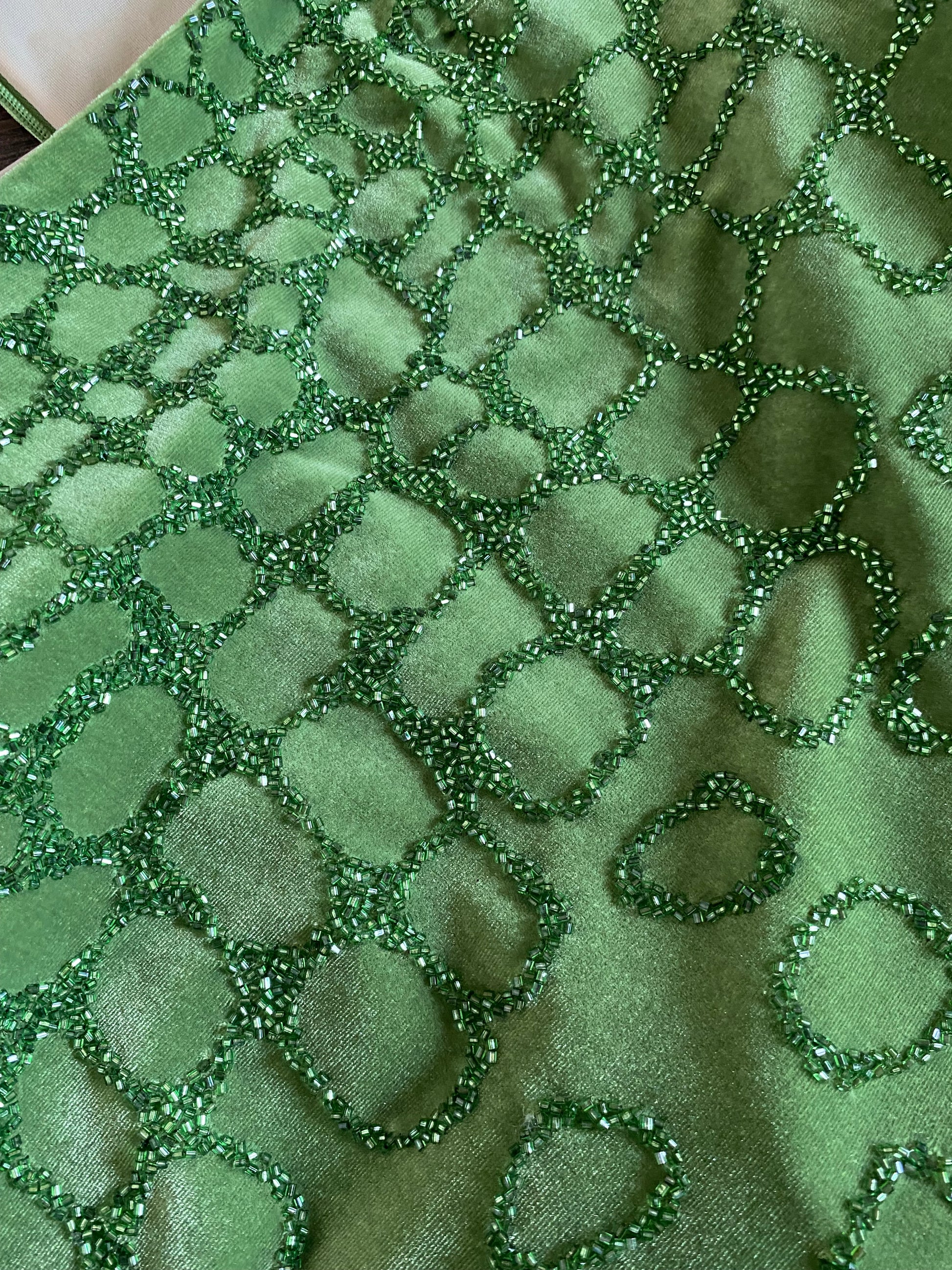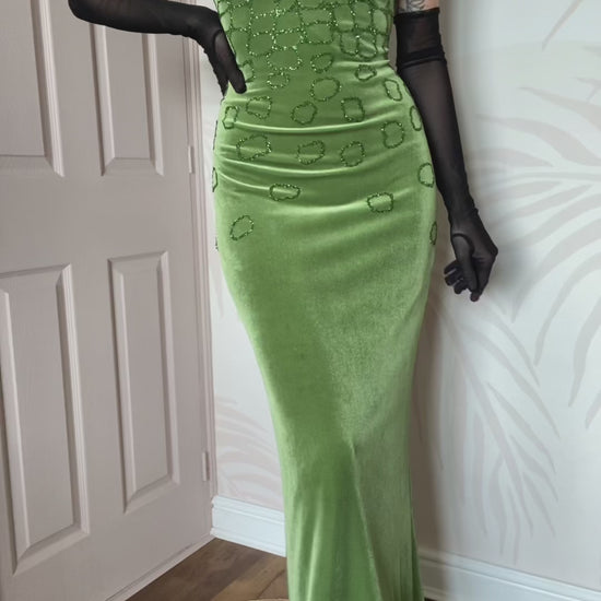 Vintage Frank Usher green silk blend velvet beaded stretch evening dress with a zip up the back UK 12-14
