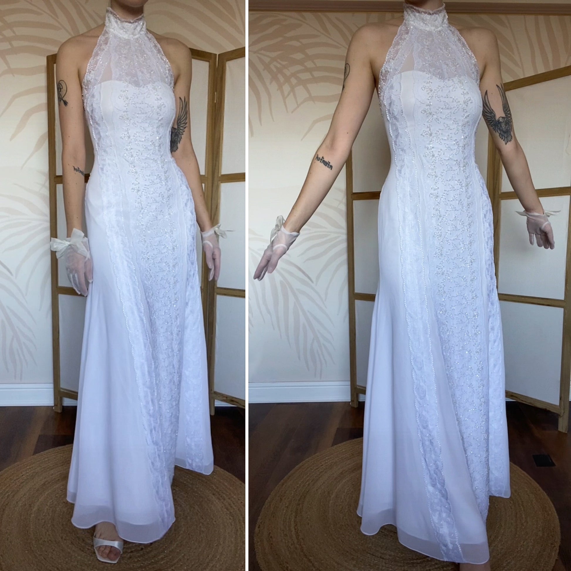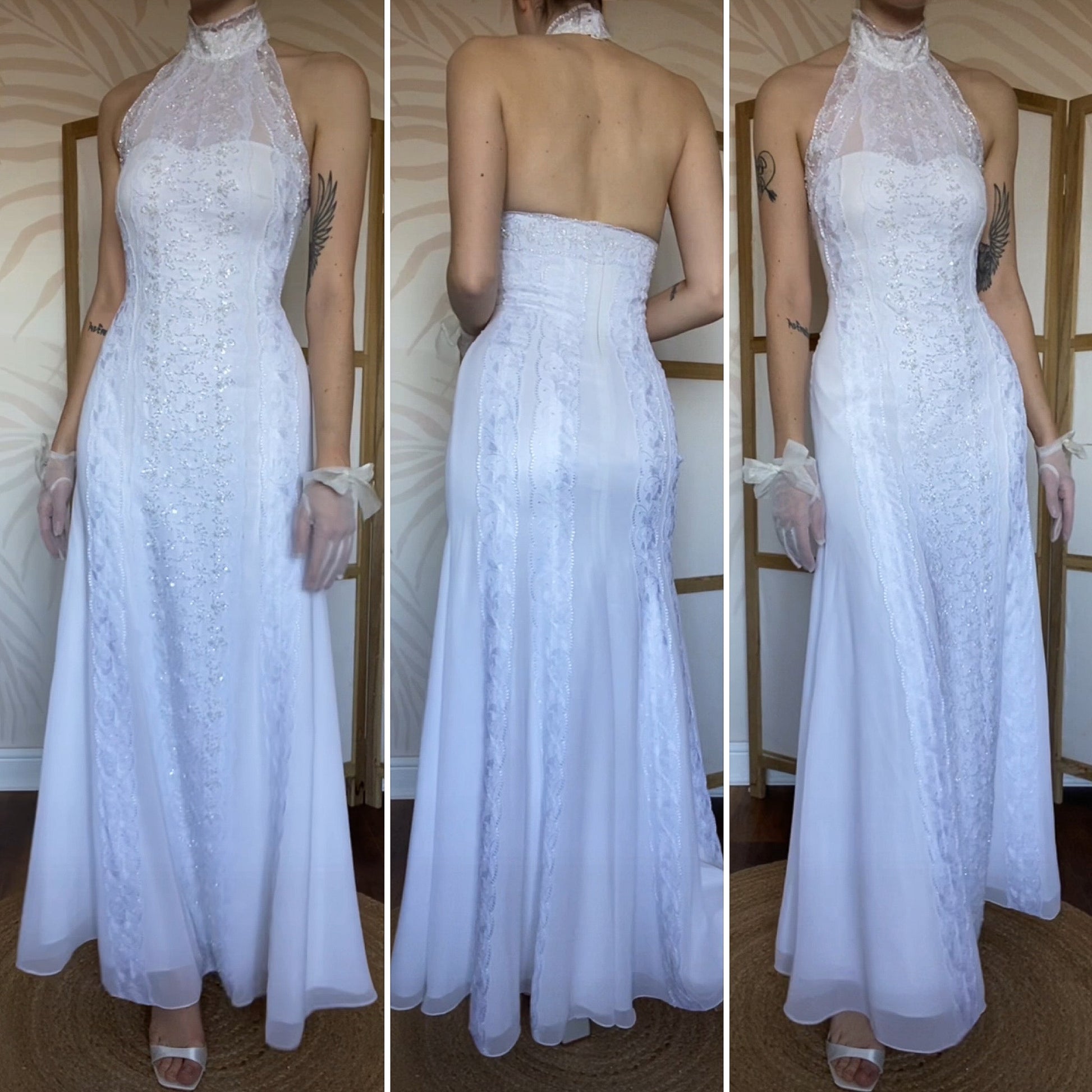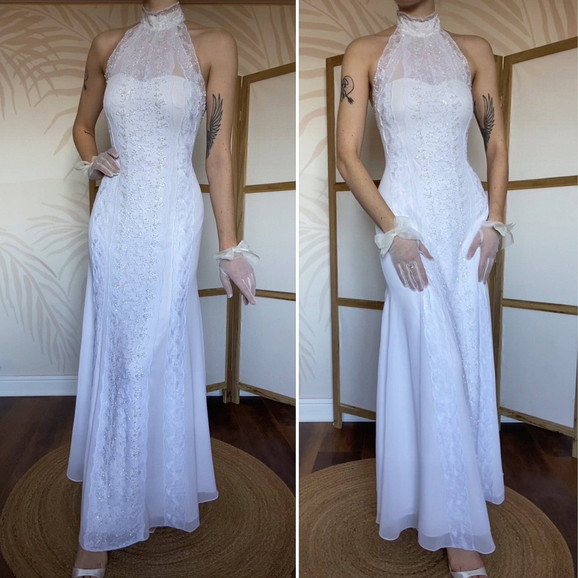 Frank Usher white wedding dress with a high neck, lace detailing to the front & back & bead detailing to the front - the dress has a padded bust, boned bust & waist, a zip up the back & button fastenings at the back of the neck UK 12