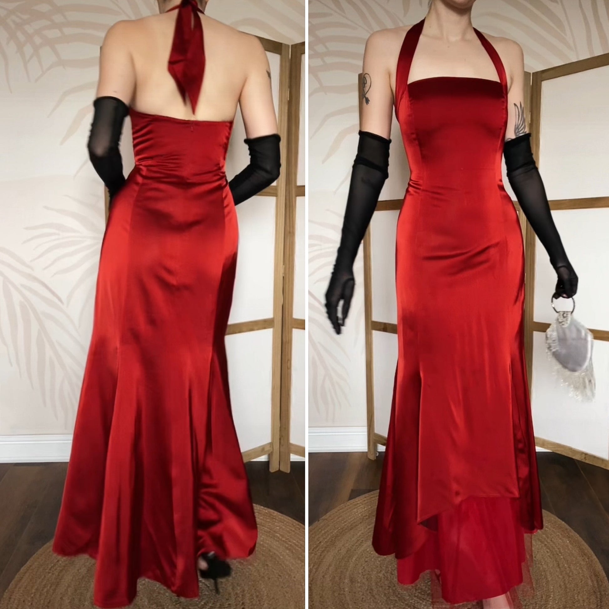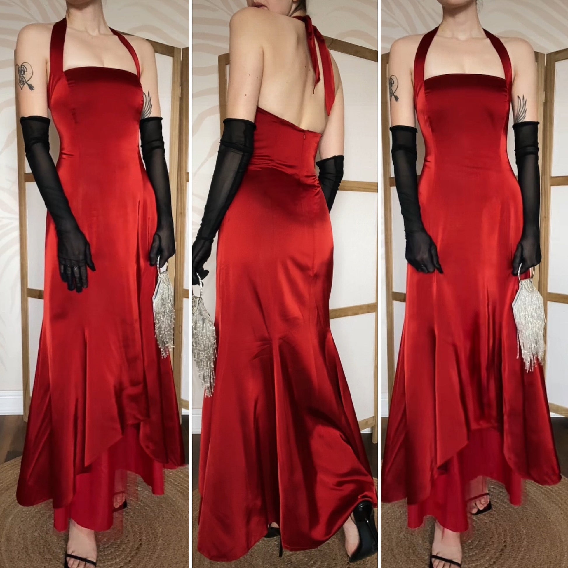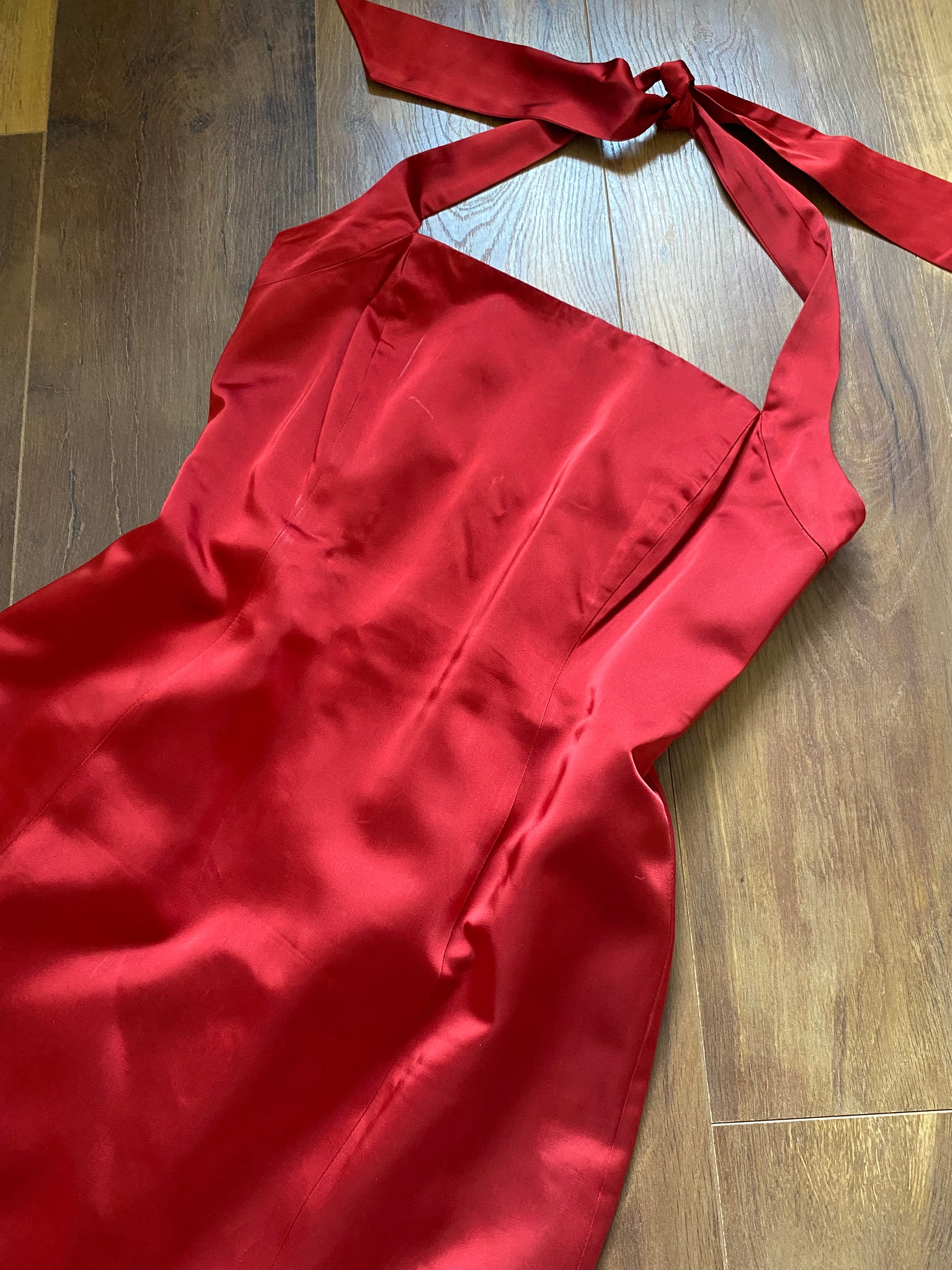 Red Gina Bacconi halter-neck evening dress with netted fishtail hem, a boned bust & waist & a zip up the back UK 14
