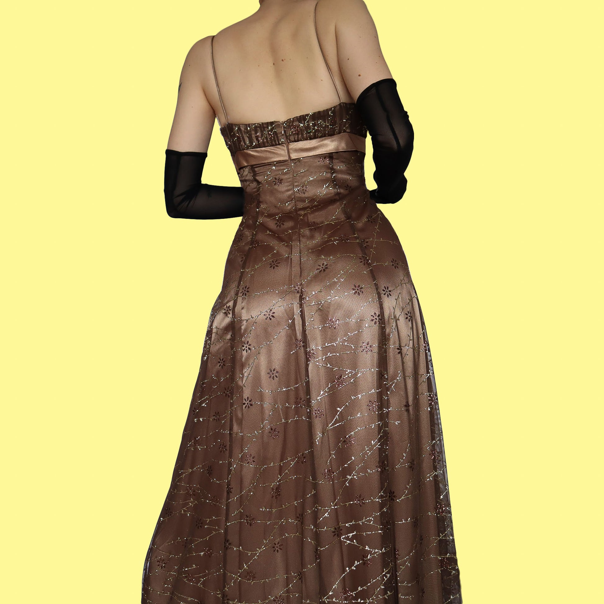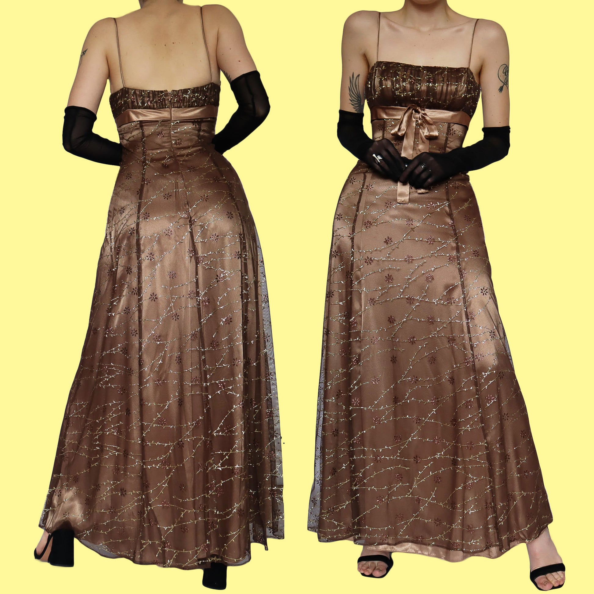 🌹Golden brown evening dress with a glittery floral overlay, a satin bow around the waist & a zip up the back UK 10🌹