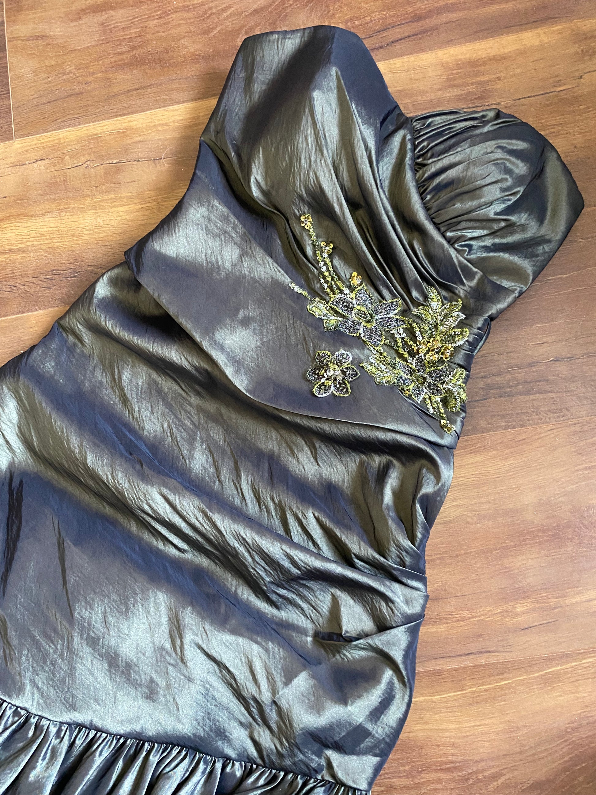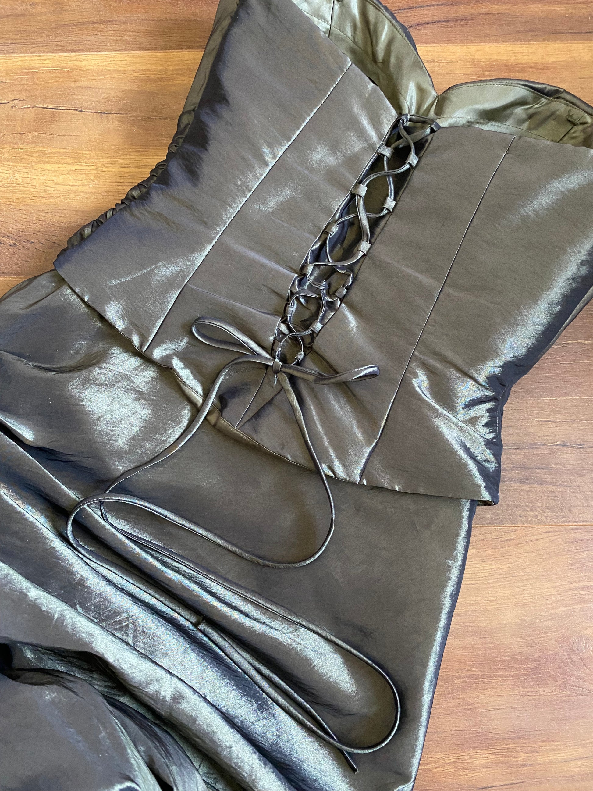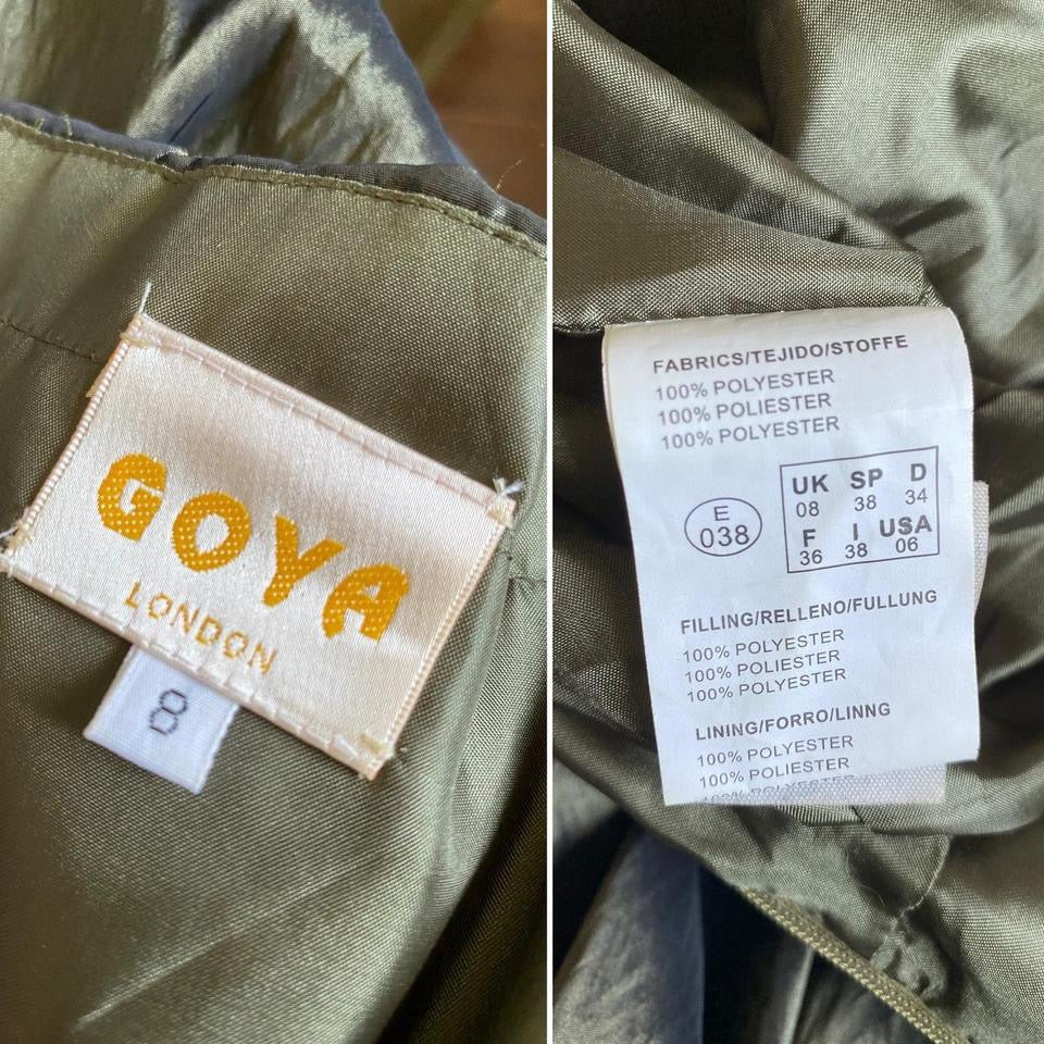 Green strapless Goya prom dress with a corset style top half with boning, a layered fishtail skirt with a tull hem, an adjustable lace up back, a padded bust, a zip up one side & a matching shawl uk 8
