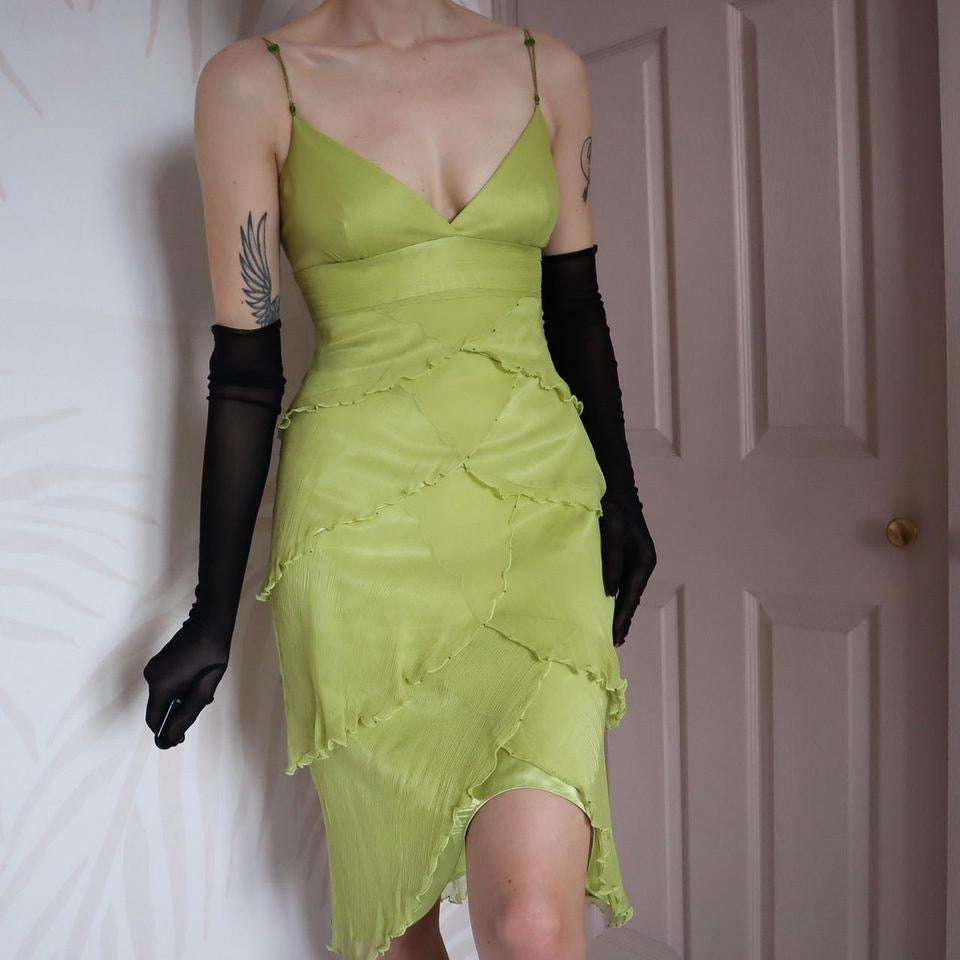100% silk light green mini dress with layering, bead straps & a zip up the side UK 12