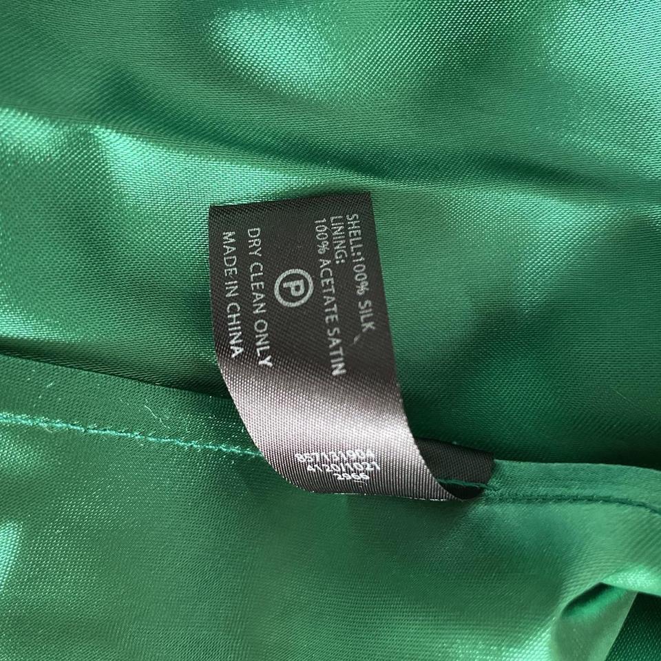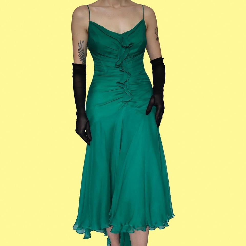 100% silk green midi dress with a frill down the front, a longer trail down the back & a zip up the side UK 10